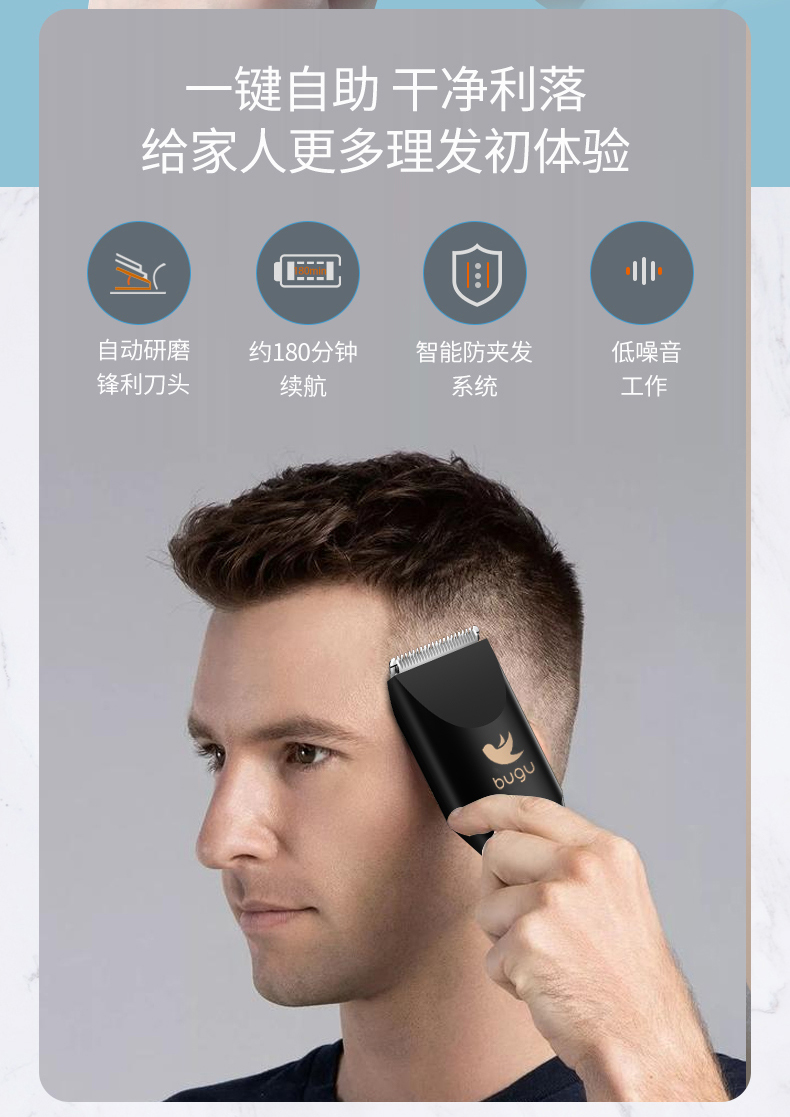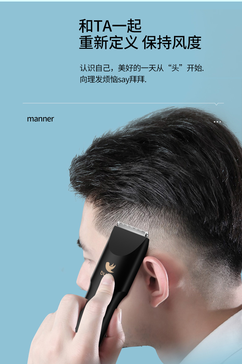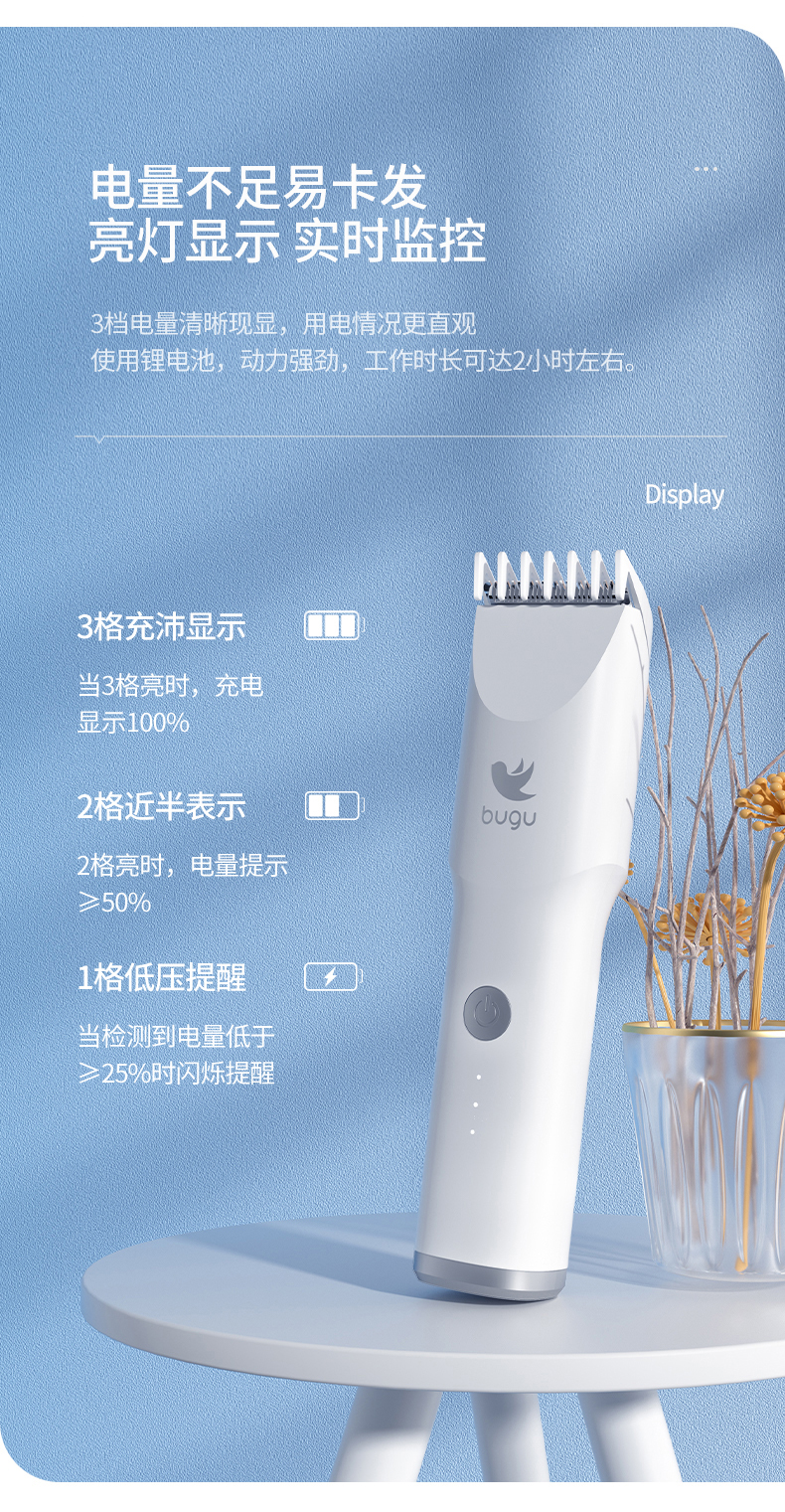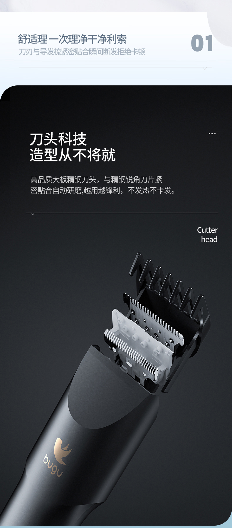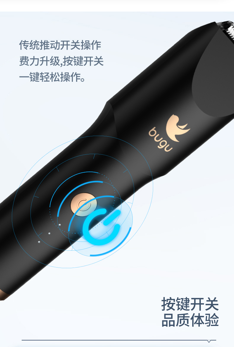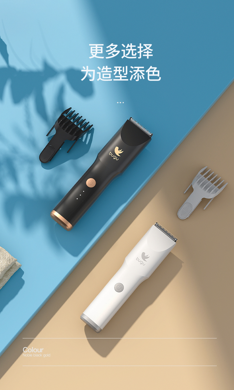 这款布谷的理发器,全机身可水洗,清洁方便,自带电量显示。高品R型钛金陶瓷刀头,随意贴近,不易划伤,7档限位,可剪不同长度;低噪音设计,5V强劲电机,USB充电,充插两用,电池容量1200MAh,续航时长约2小时。