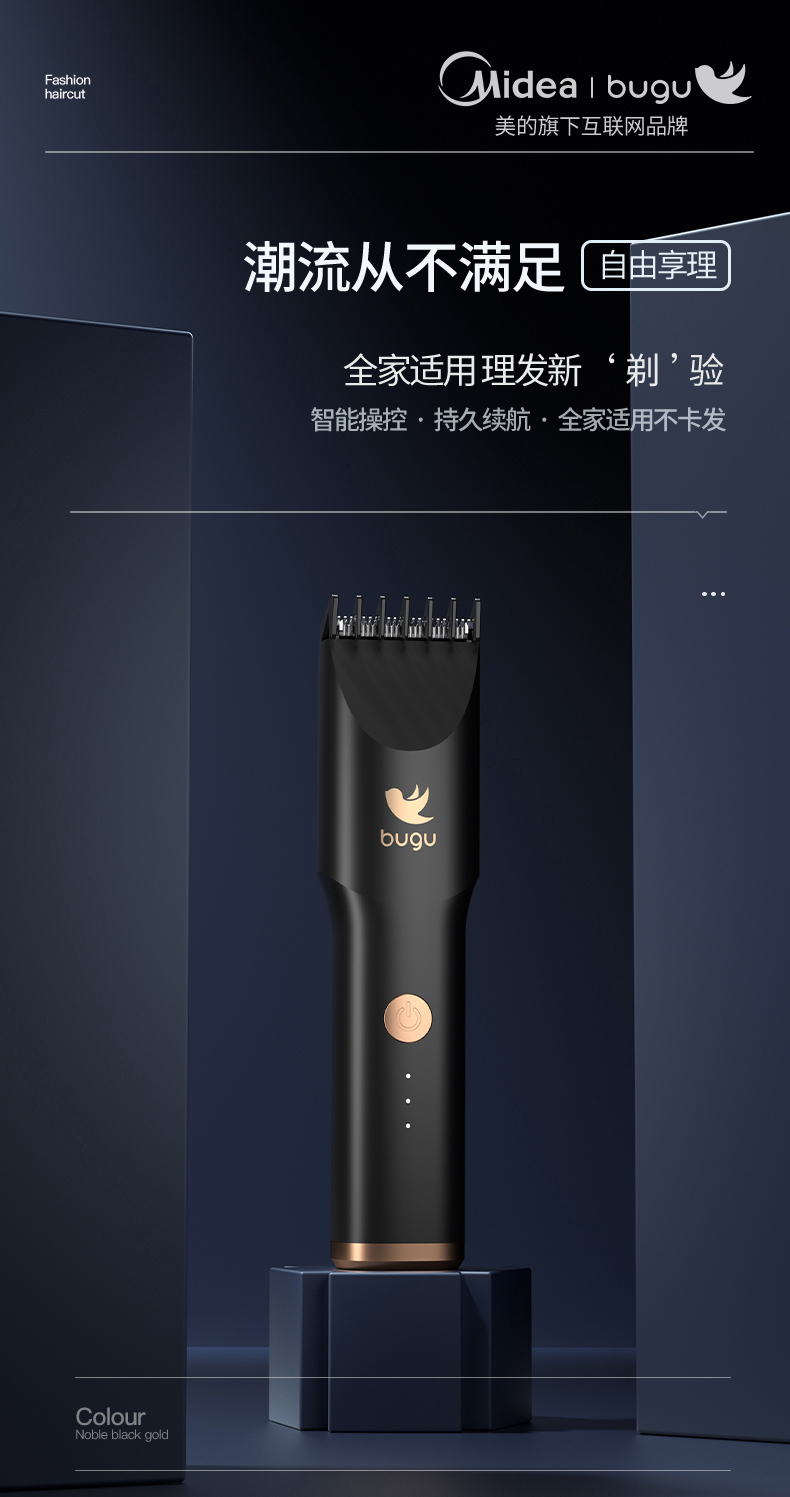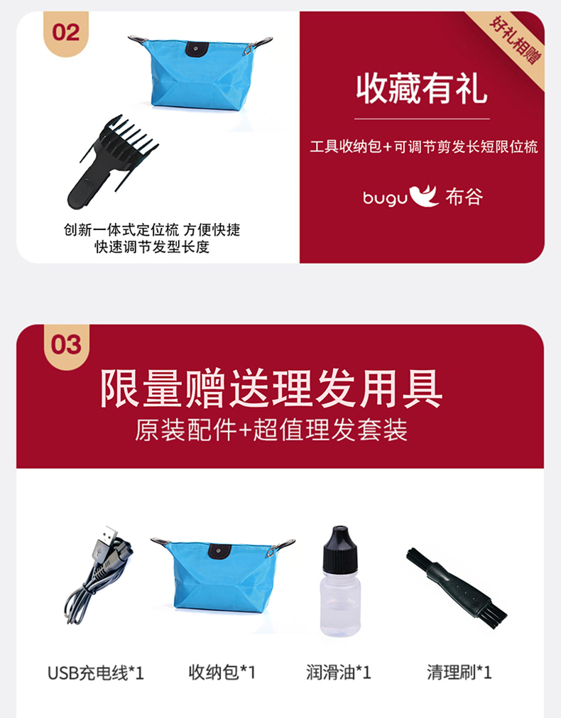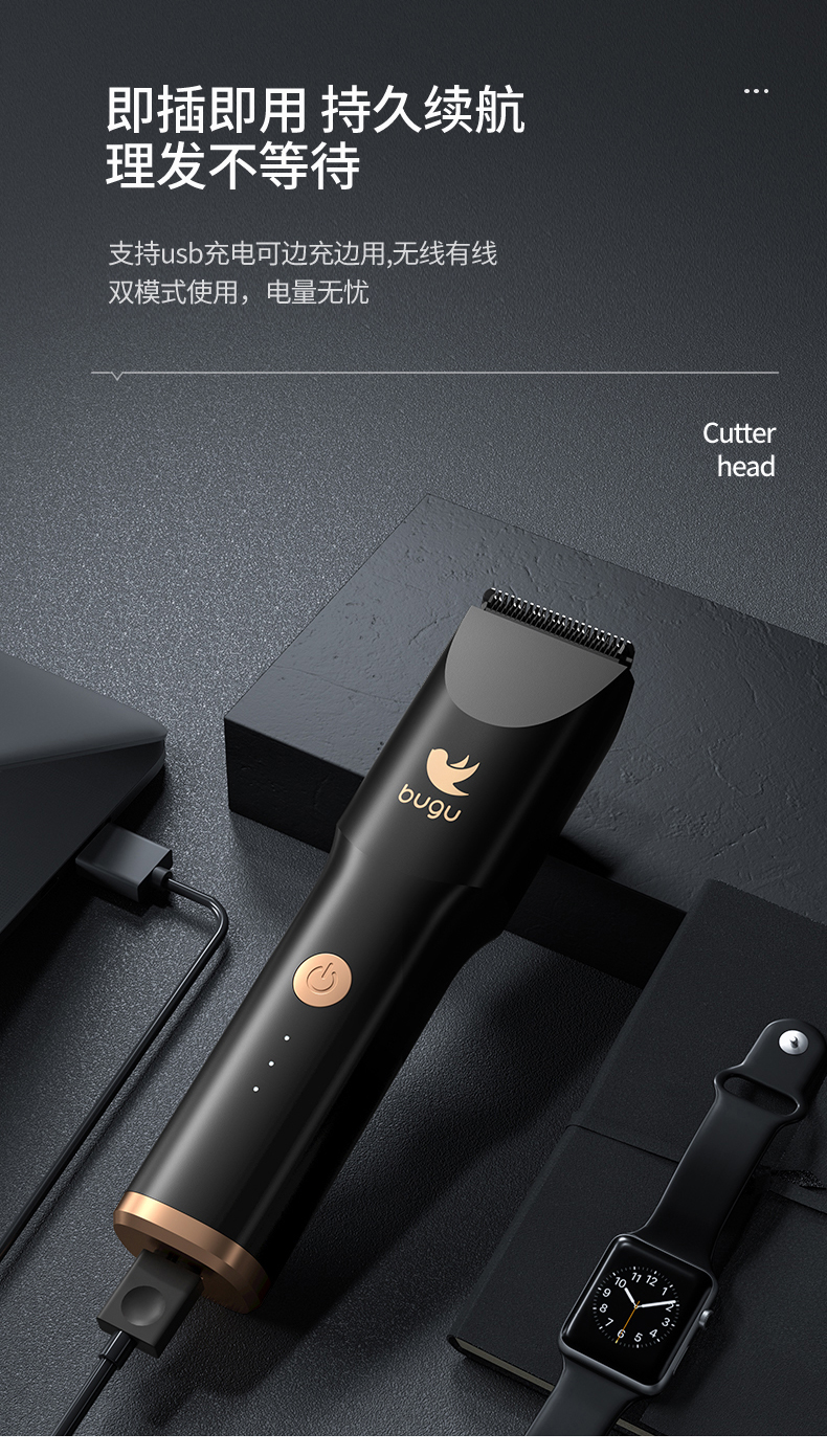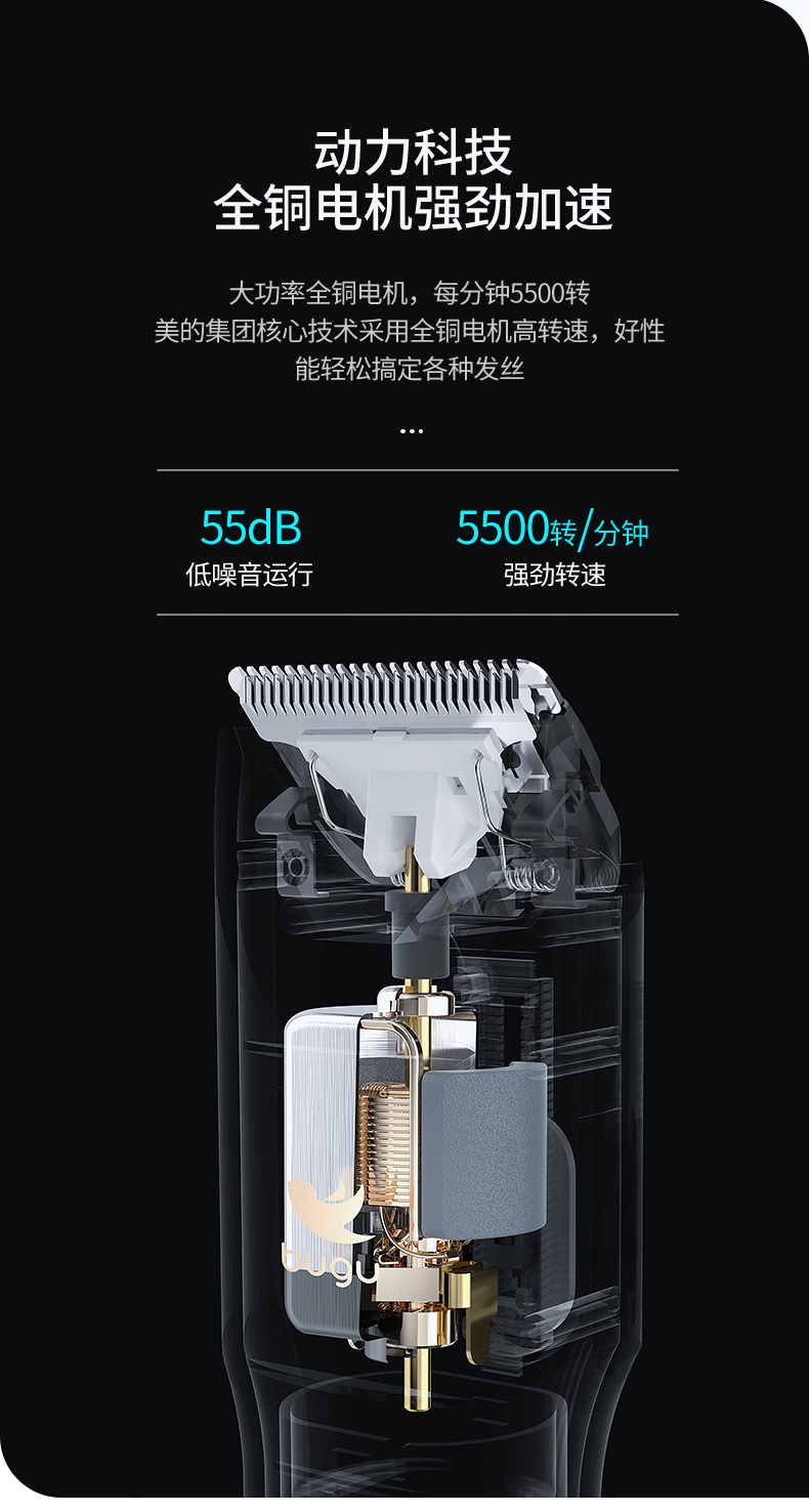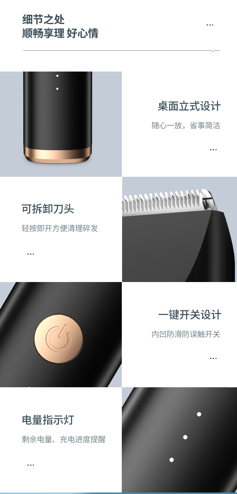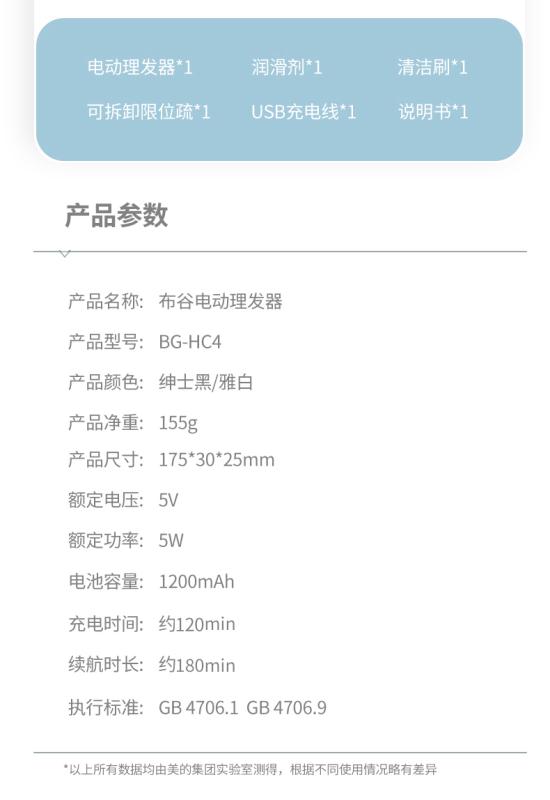 这款布谷的理发器,全机身可水洗,清洁方便,自带电量显示。高品R型钛金陶瓷刀头,随意贴近,不易划伤,7档限位,可剪不同长度;低噪音设计,5V强劲电机,USB充电,充插两用,电池容量1200MAh,续航时长约2小时。
