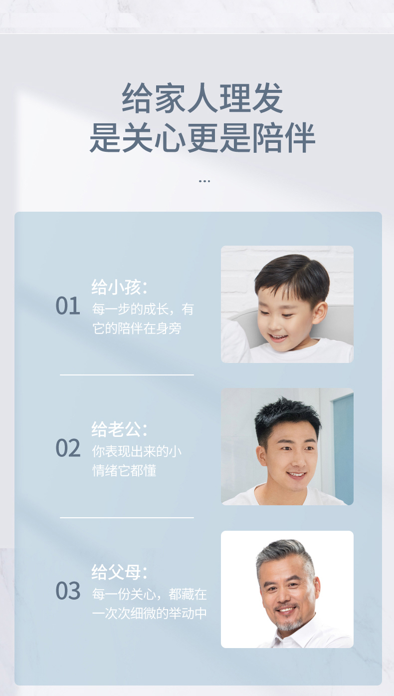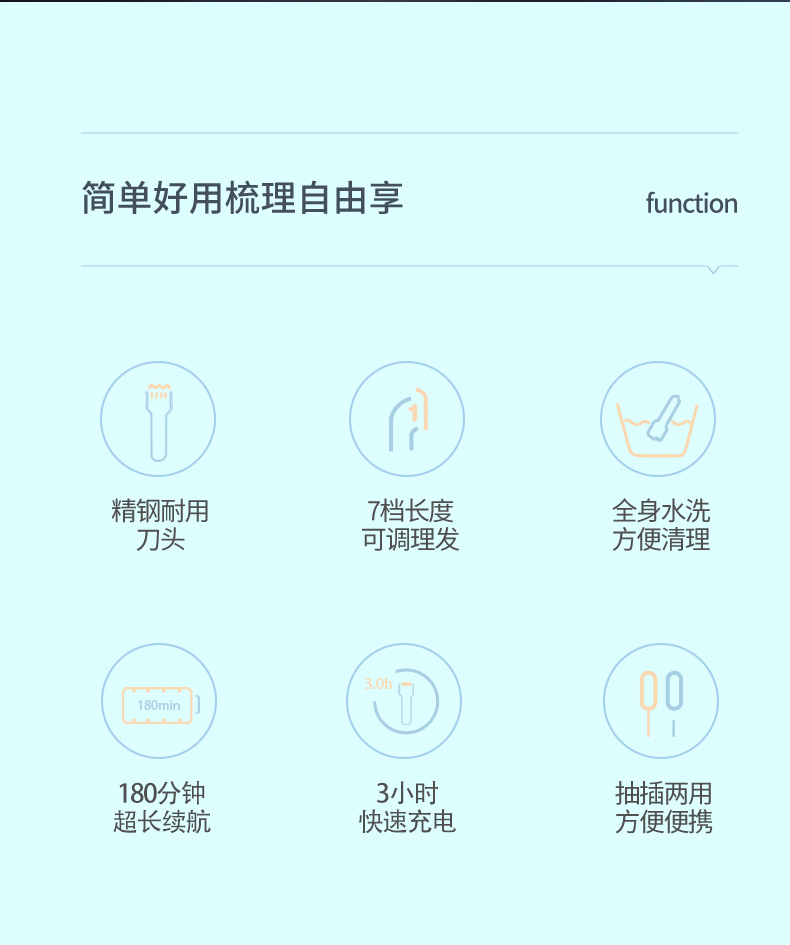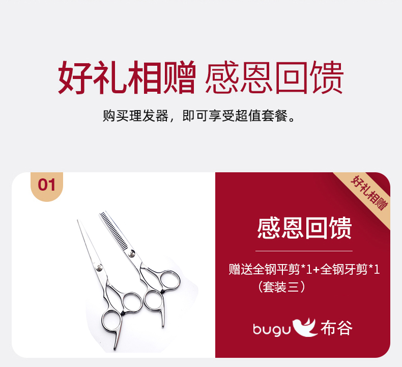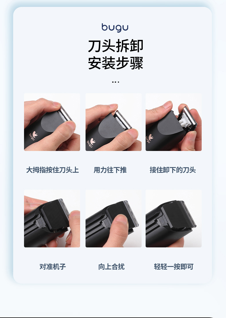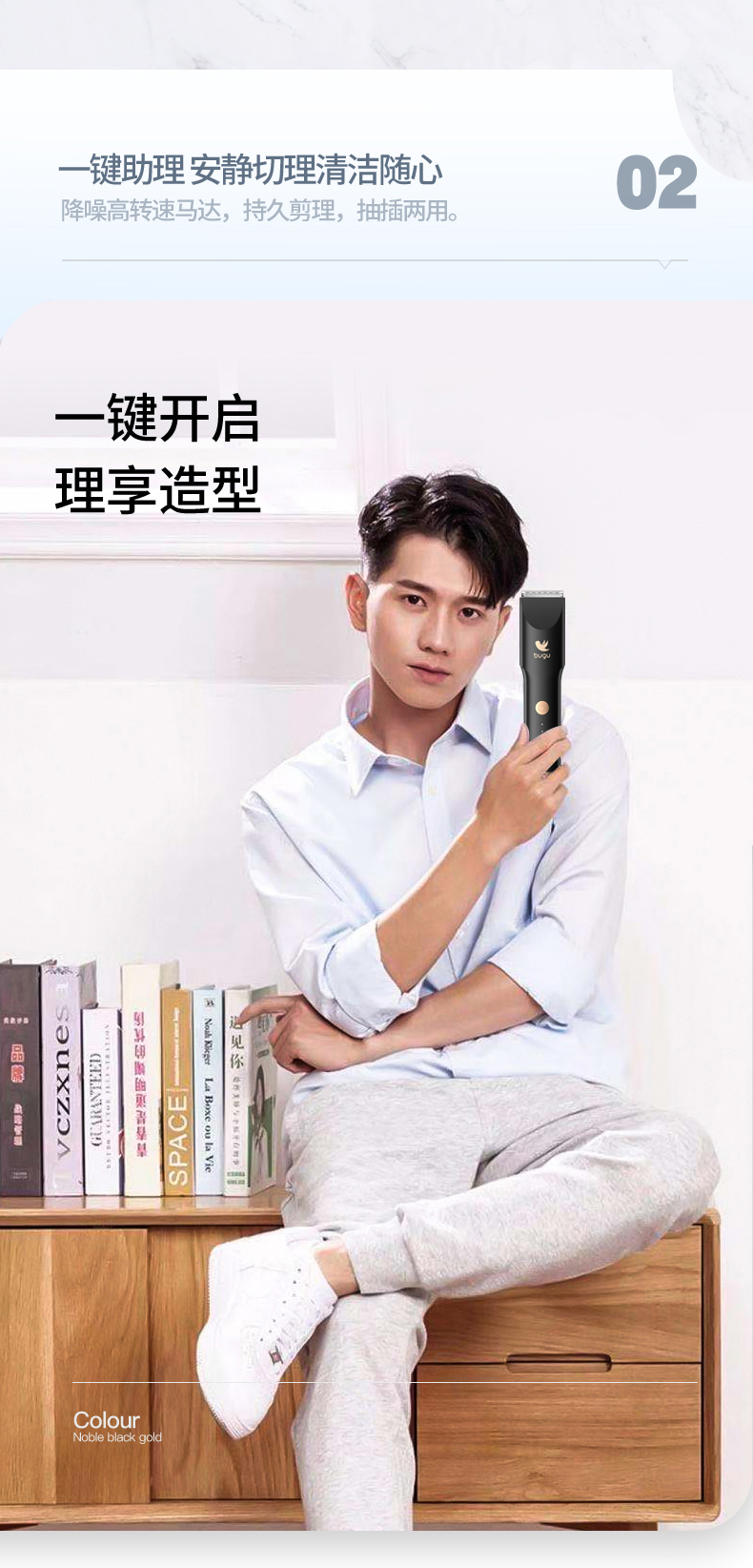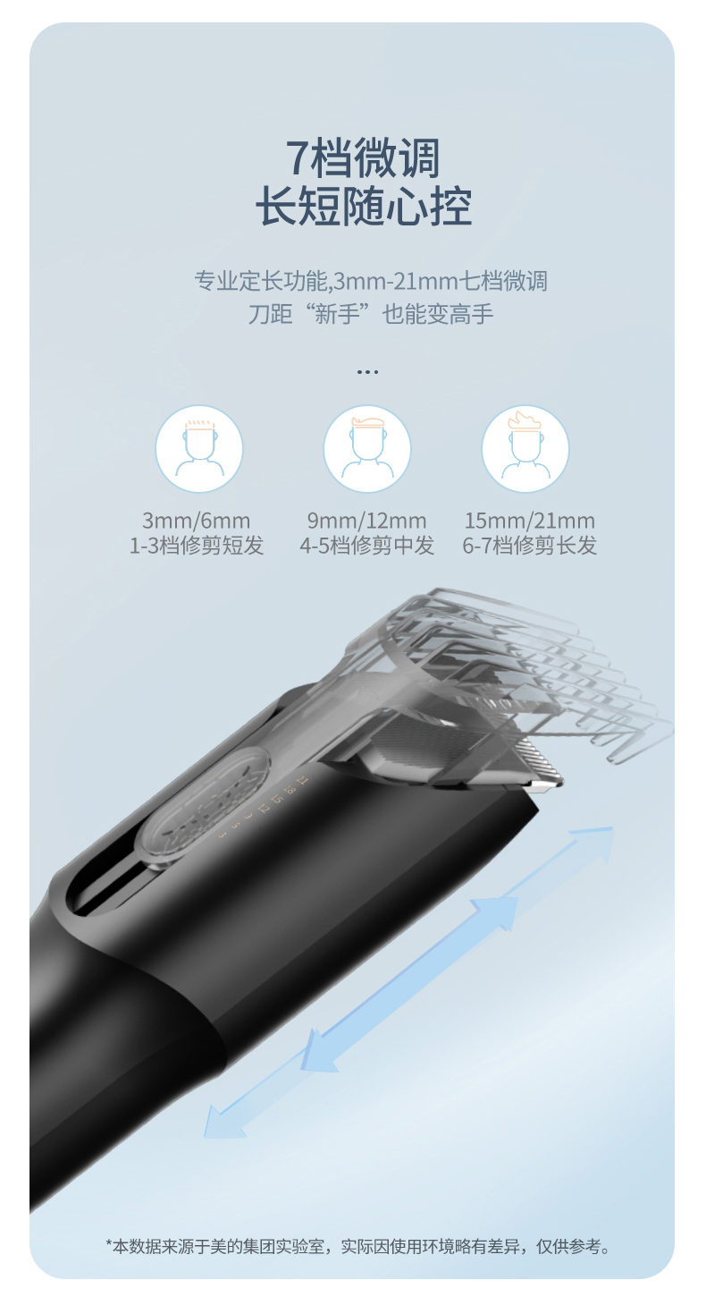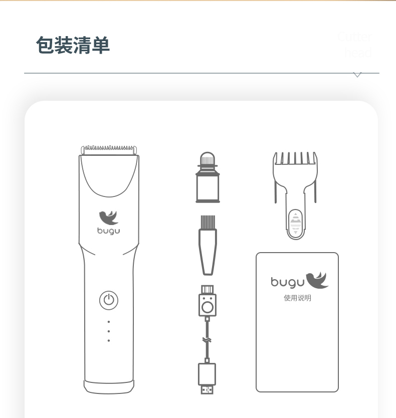 这款布谷的理发器,全机身可水洗,清洁方便,自带电量显示。高品R型钛金陶瓷刀头,随意贴近,不易划伤,7档限位,可剪不同长度;低噪音设计,5V强劲电机,USB充电,充插两用,电池容量1200MAh,续航时长约2小时。