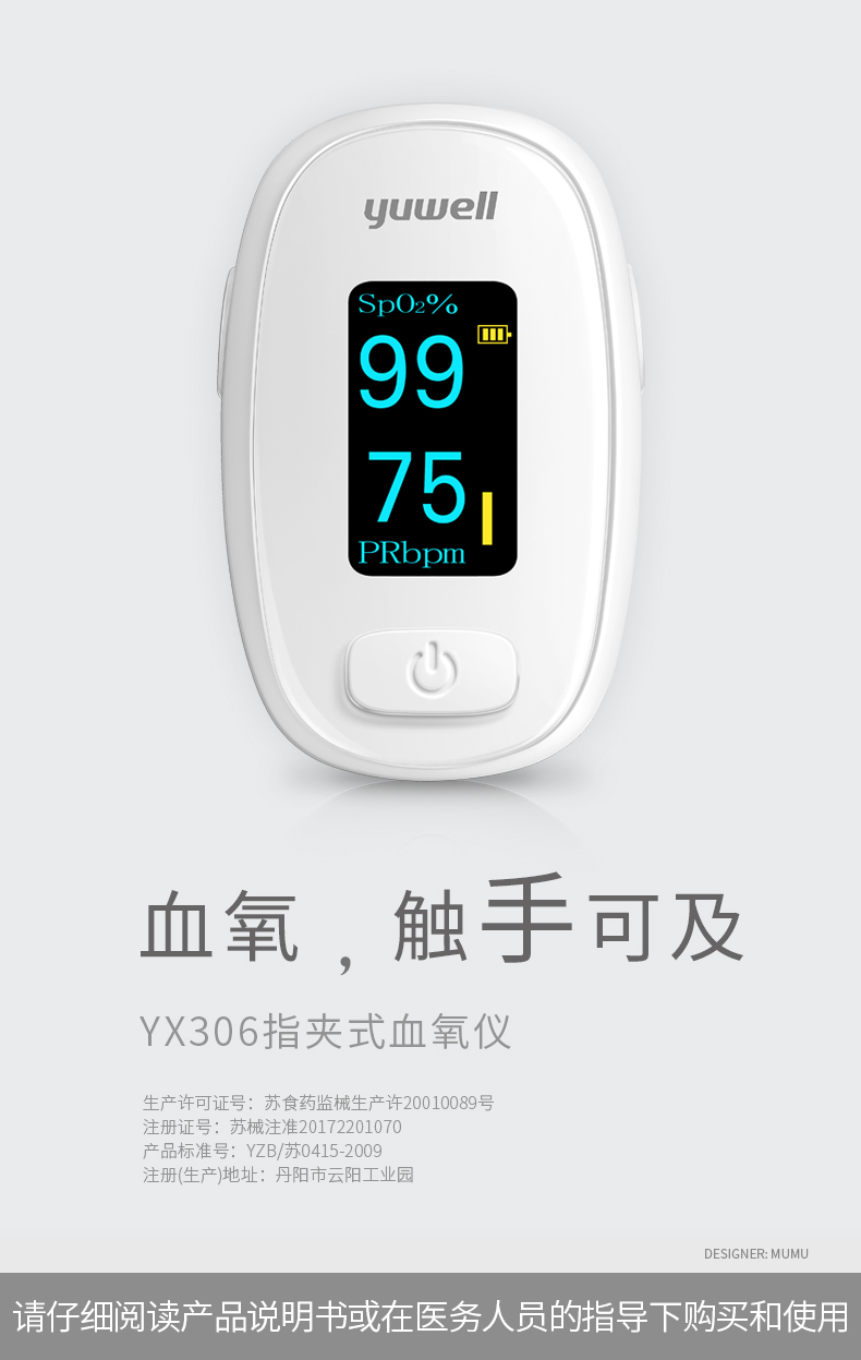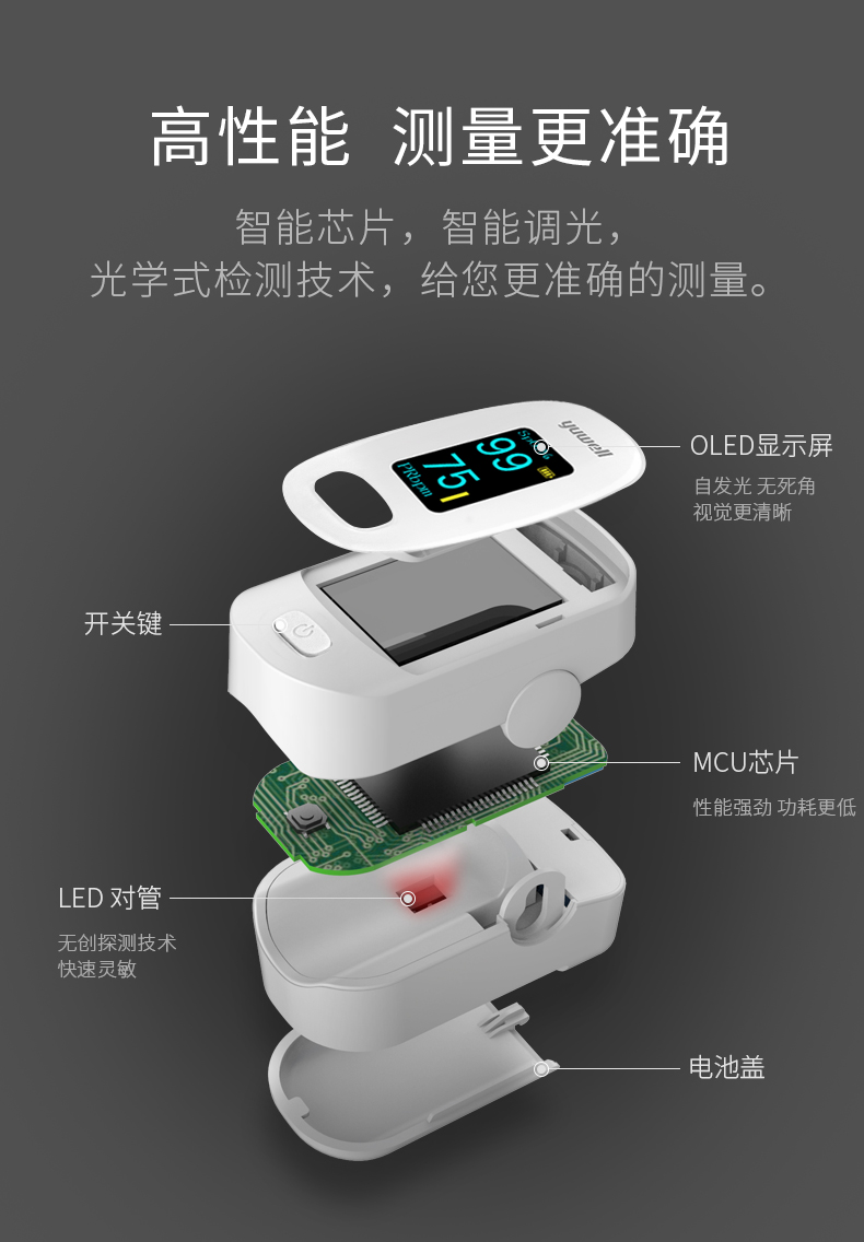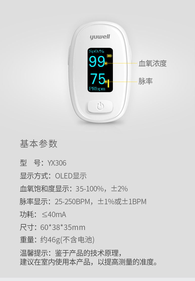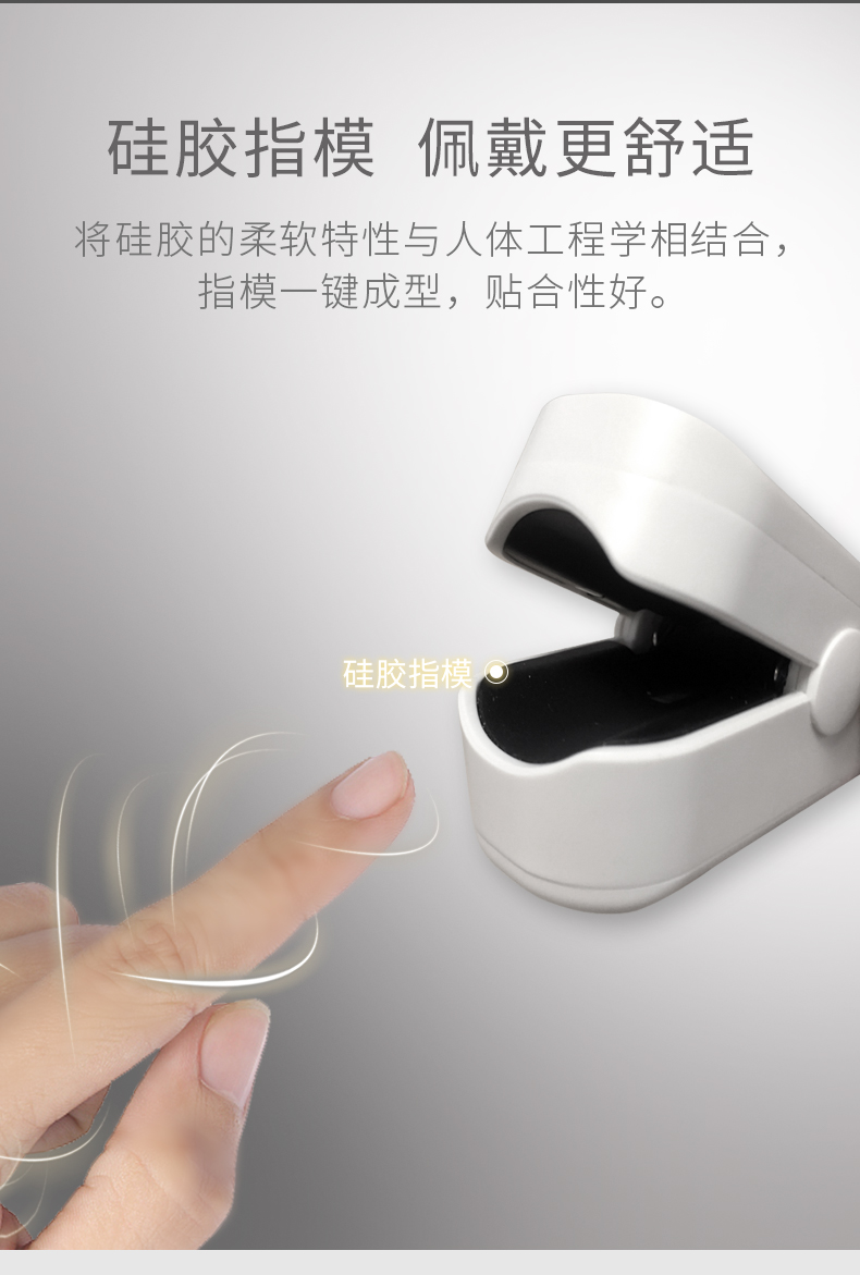 这款鱼跃 医用指夹式血氧仪,能随时随地的检测人体的血氧浓度和脉搏,将硅胶的柔软特性与人体工程学相结合,指模一键成型,贴合性好,不夹手。