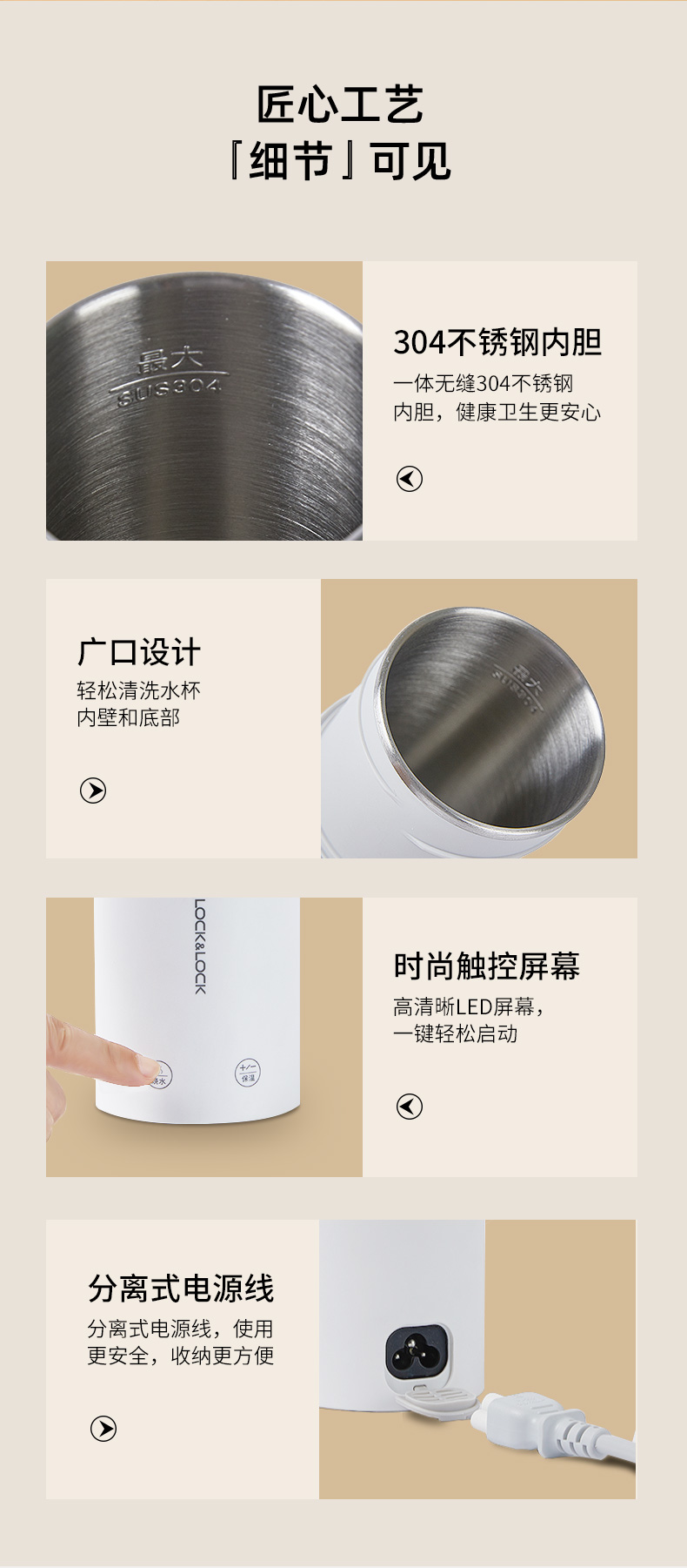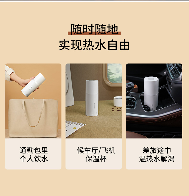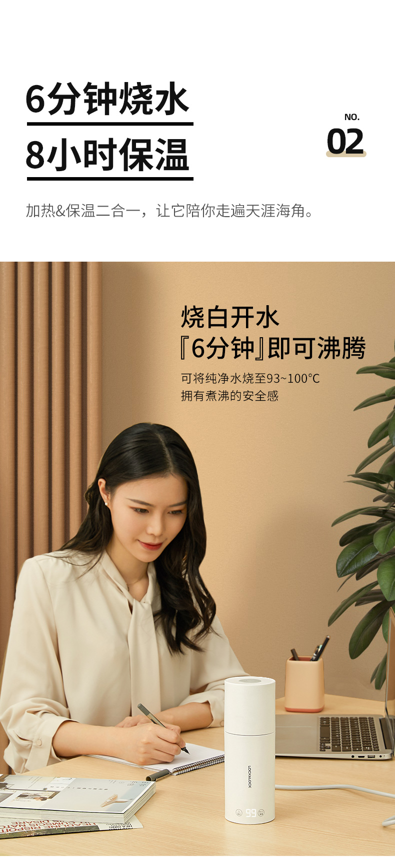 300w额定功率,40-100℃ 共9档精准控温,可满足泡奶、沏茶、冲咖啡等不同用水需求。烧水快速6分钟即可沸腾,8小时插电保温,随时待命,实时显示温度,容量350ml整杯净重375g,一瓶矿泉水大小比矿泉水还轻。单手可握,女生也可轻松随手拿,全身密封不漏水,居家、办公、旅行随身携带非常方便。