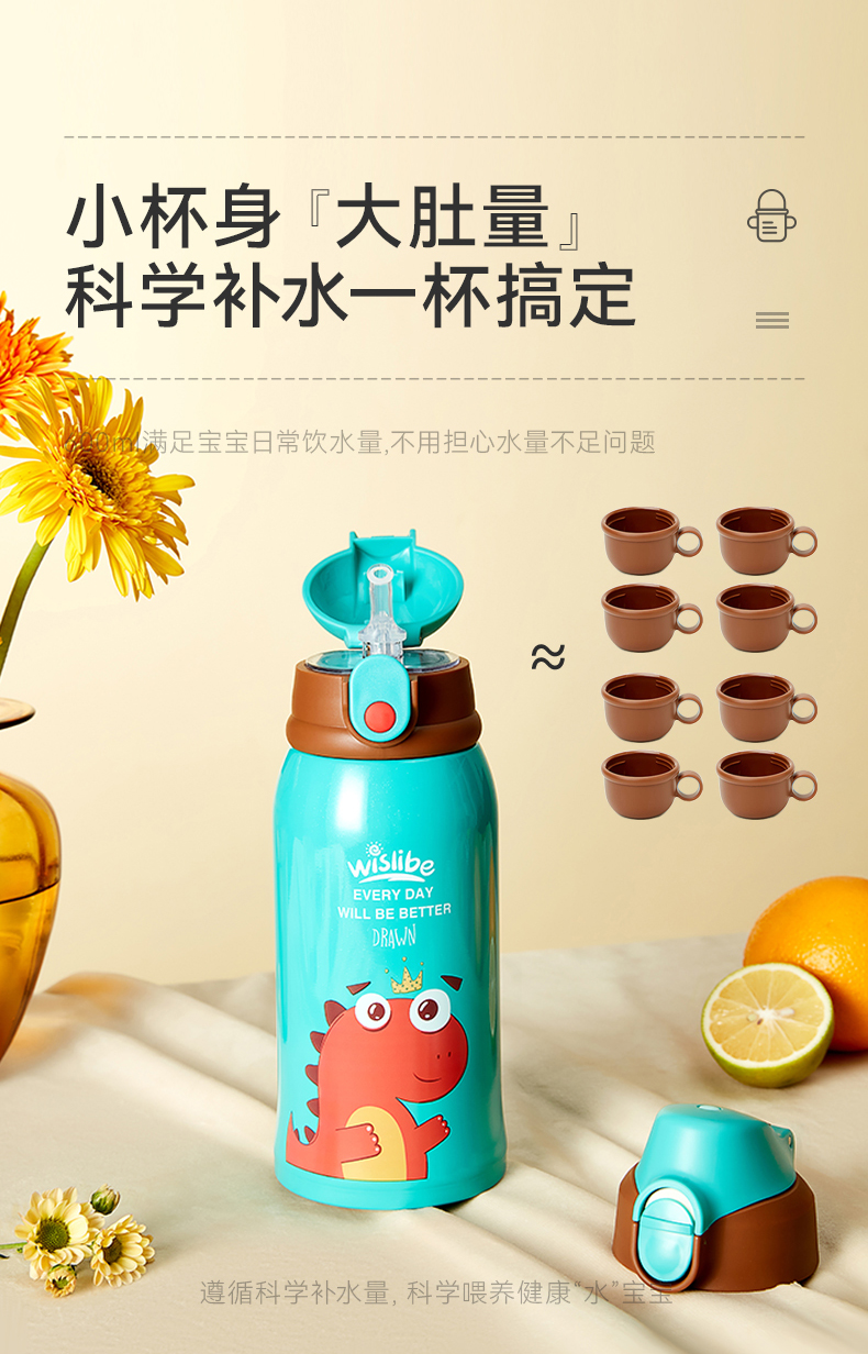 这款WISLIBE保温杯双层真空保温,,内胆升级医用316不锈钢材质,相比304不锈钢耐腐蚀更强,镜面设计,易清洁,污垢不易堆积。外观设计萌萌插画,童趣十足,随杯还赠送织物杯带,使用方便。