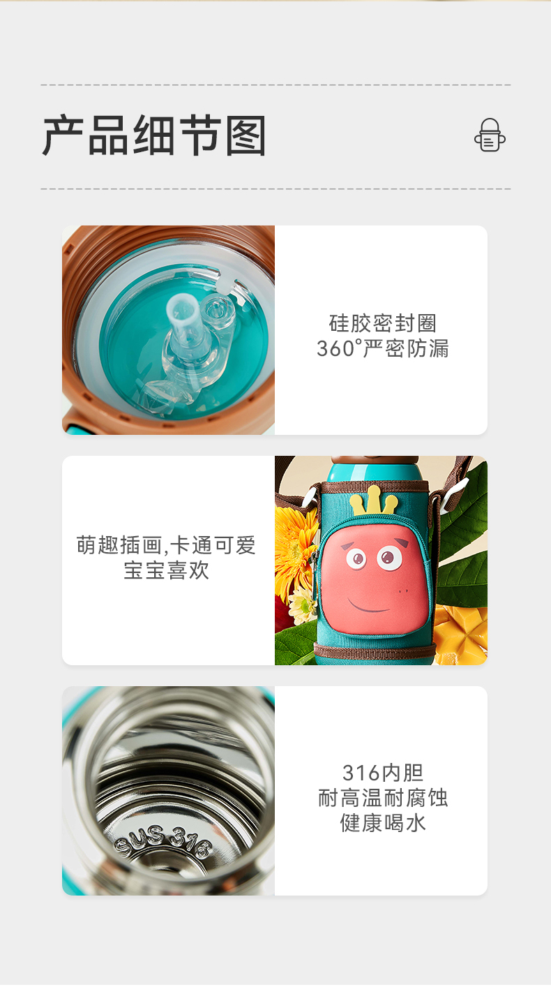 吸管式弹跳杯盖:内里吸管为硅胶材质,内设排气孔,平衡内外气压,开盖防喷溅。吸水更轻松;食品级硅胶材质,仿母乳软硬度设计,不含BPA,耐啃咬无异味不变形,保证儿童用水安全。