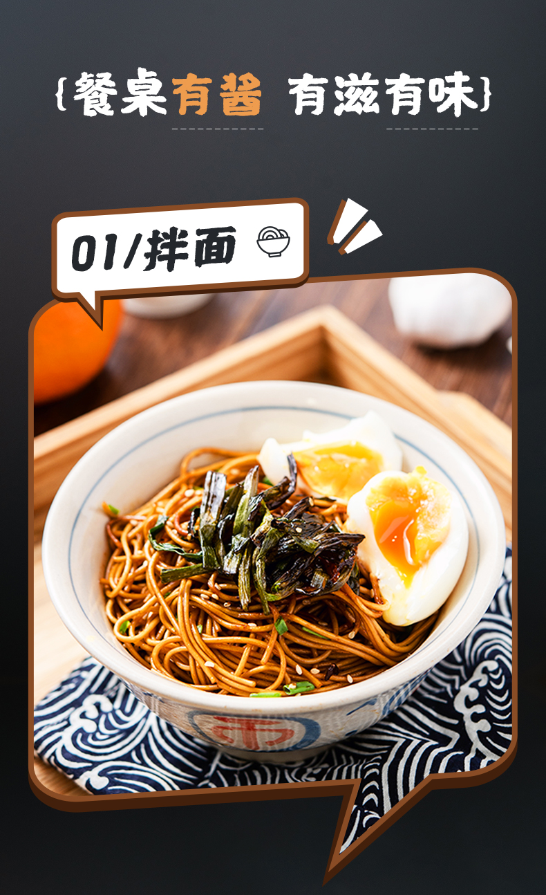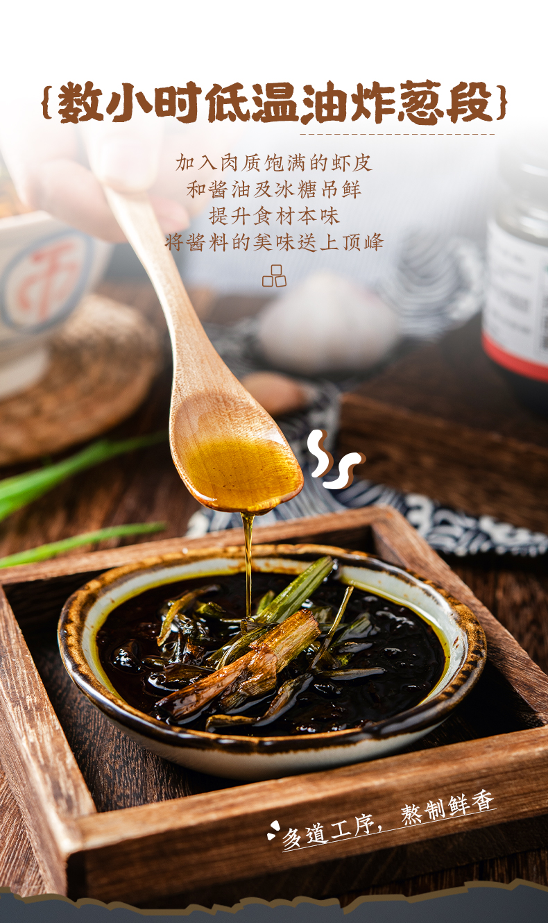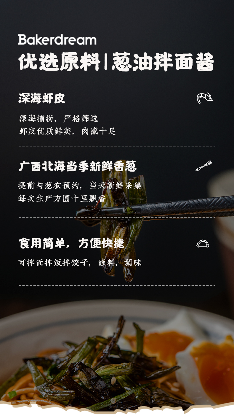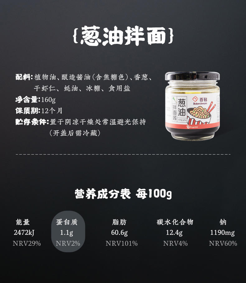 这款百钻葱油拌面酱,是一款不辣的酱汁,选用广西北海当季新鲜香葱、深海虾皮为原料,先将葱段经过数小时的低温油炸,再将入肉质饱满的虾皮和酱油及冰糖调鲜,将酱料的美味送上顶峰,葱香四溢,酱汁油润,0防腐剂、0色素添加,可用于拌面、拌饭、蘸料、调味 。