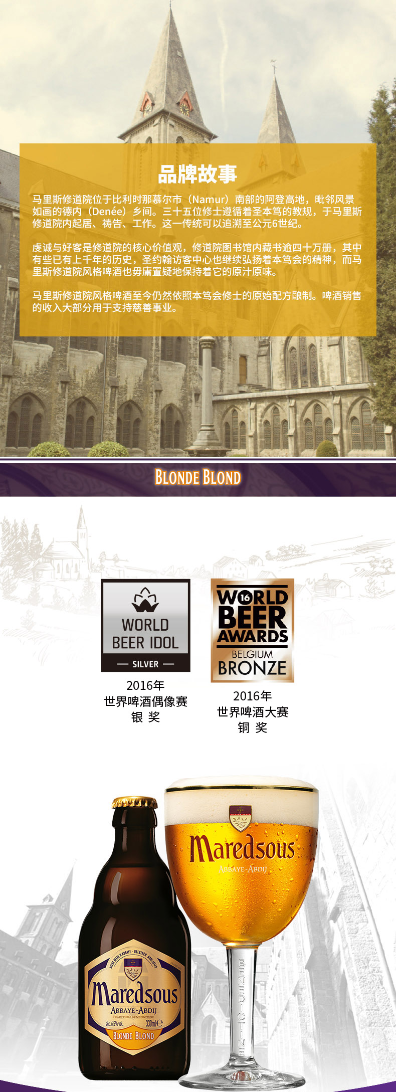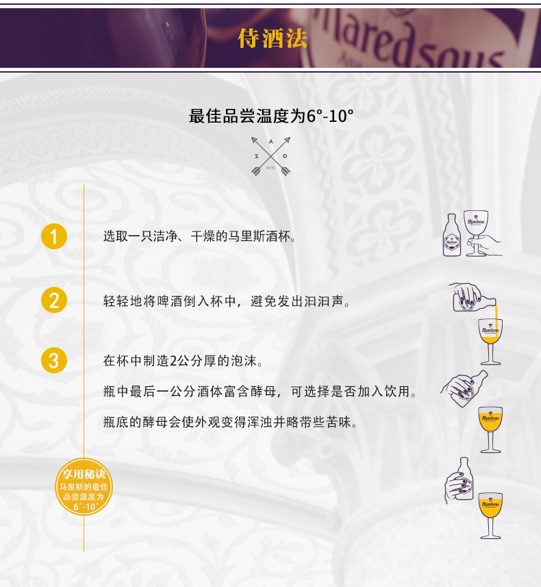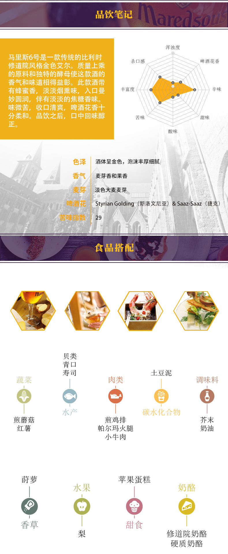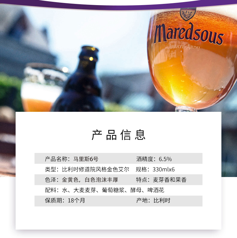 马里斯是一款传统的比利时修道院风格啤酒。质量上乘的原料和 独特的酵母使这款酒的香气和味道相得益彰。此款酒带有蜂蜜香,淡淡烟熏味,入口曼妙圆润,伴有淡淡的焦糖香味。味微苦,收口清爽, 啤酒花香十分柔和。品饮之后,口中回味醇正。