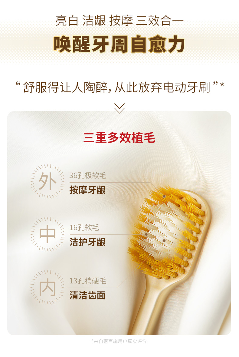 这款牙刷是第2代升级款,革新加宽设计,宽幅65孔8列组合牙刷,清洁面25%UP,由三层不同柔软度的高密刷毛组成,全方位满足洁齿护齿需求,超纤细仅有0.02mm,能深入清洁牙龈沟,有效避免牙龈出血、红肿、敏感等问题,同时具有亮白、洁龈、按摩的作用。