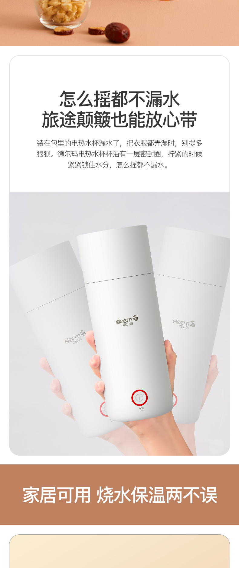 这款德尔玛 便携烧水杯,100℃真沸腾,水烧开后自动保温,350ml容量,仅有一瓶矿泉水大小,外出旅行携带非常方便。