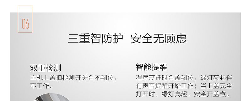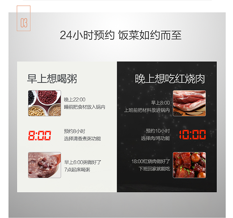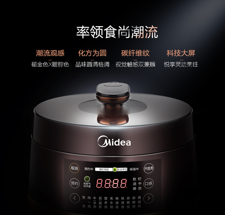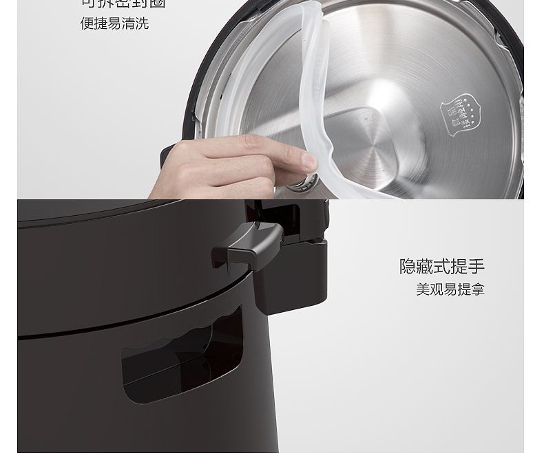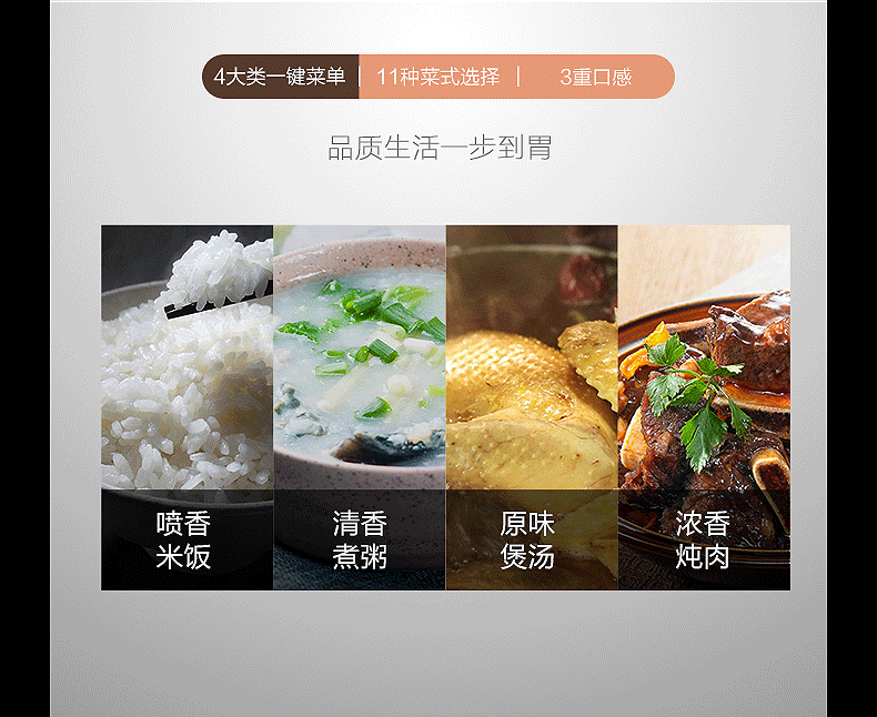 拥有4大类一键菜单,11大功能菜单,支持3种口感选择,下厨从此变的简单,爱上做饭,并且支持24小时预约,提前预约下班到家就可以吃上香喷喷的饭菜,简单方便。一键手动排气,防烫手。上盖可立可拆,易清洗,隐藏式提手,美观易提拿。安全也是很重要的,三重智能防护,保护家人安全。如有需要可以关注一下哦~
