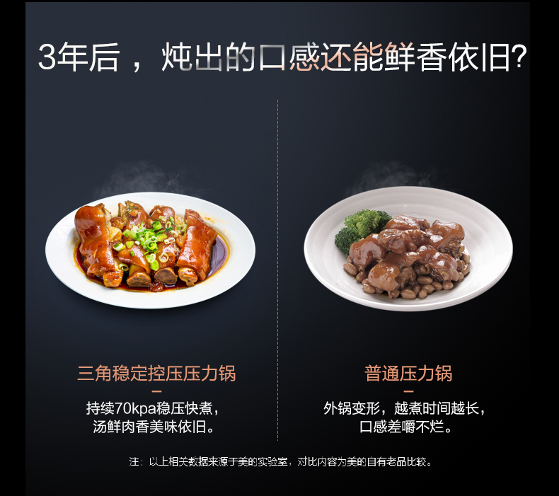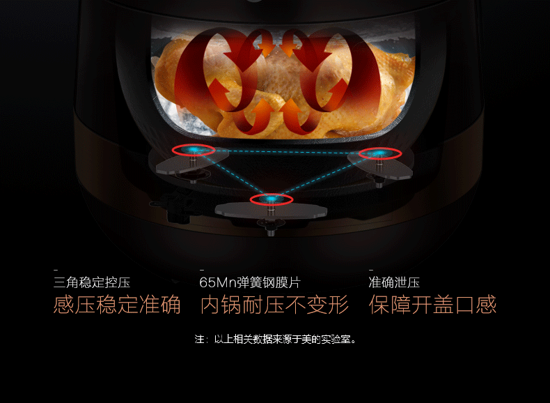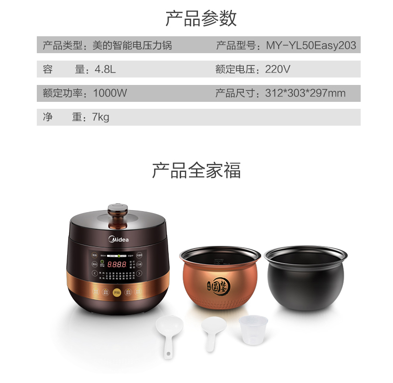 美的这款型号为MY-YL50Easy202的高压饭煲,随机身附带两个内胆,匠铜内胆用于蒸饭煮粥健康不粘,搪瓷内胆负责煲汤炖肉,无水焗抗酸碱。压力锅底部采用三角形控压,6万次耐压不变形,长时间更加可靠耐用。内置高灵敏探头,控温更精准。