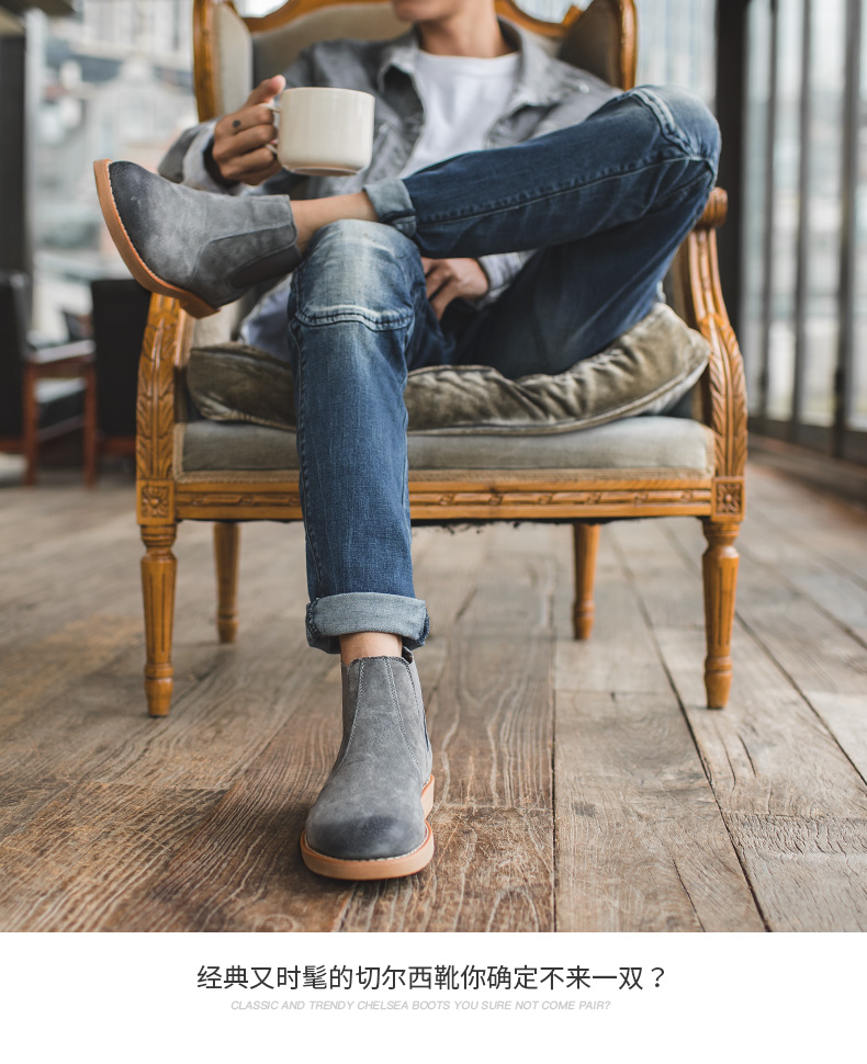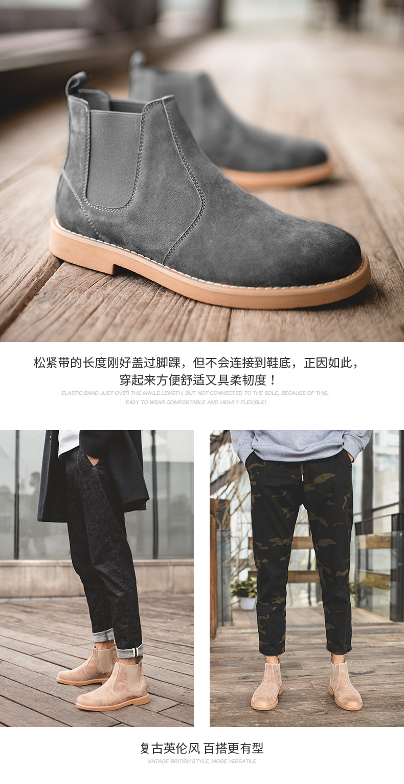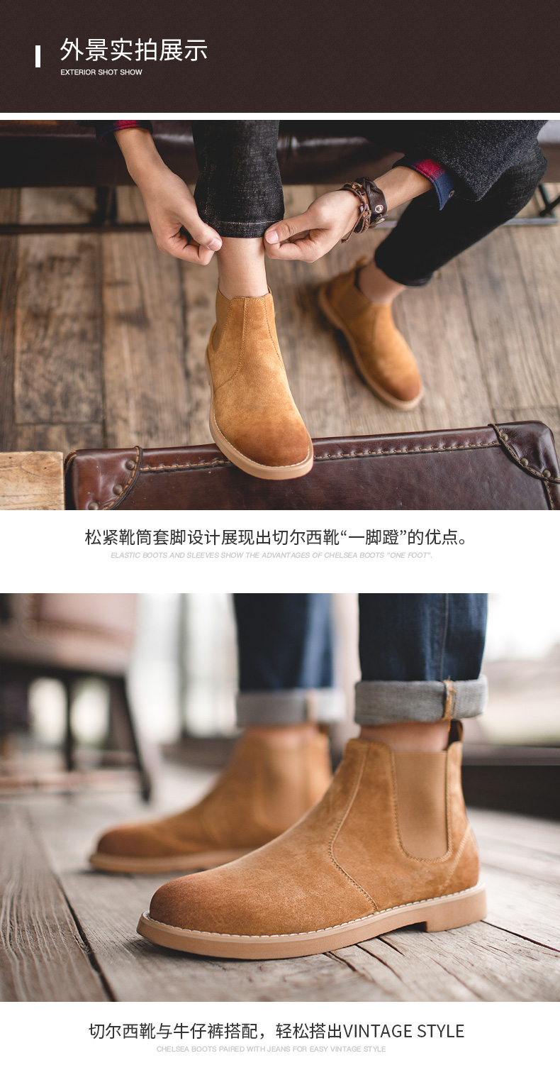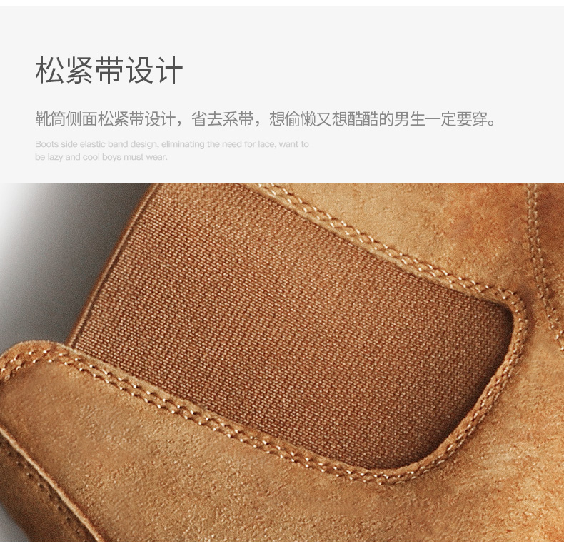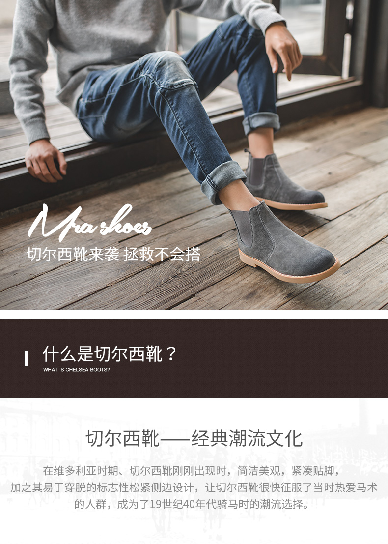 鞋底为高分子聚合橡胶大底,也就是咱们俗称的牛筋底,具有高密度、耐磨、柔软舒适的特点,侧面松紧带设计,省去了系带的麻烦,而且独特的鞋型使切尔西靴上脚特别酷,自带男人味,既可搭配牛仔裤、休闲裤,也可作为正装的配鞋。