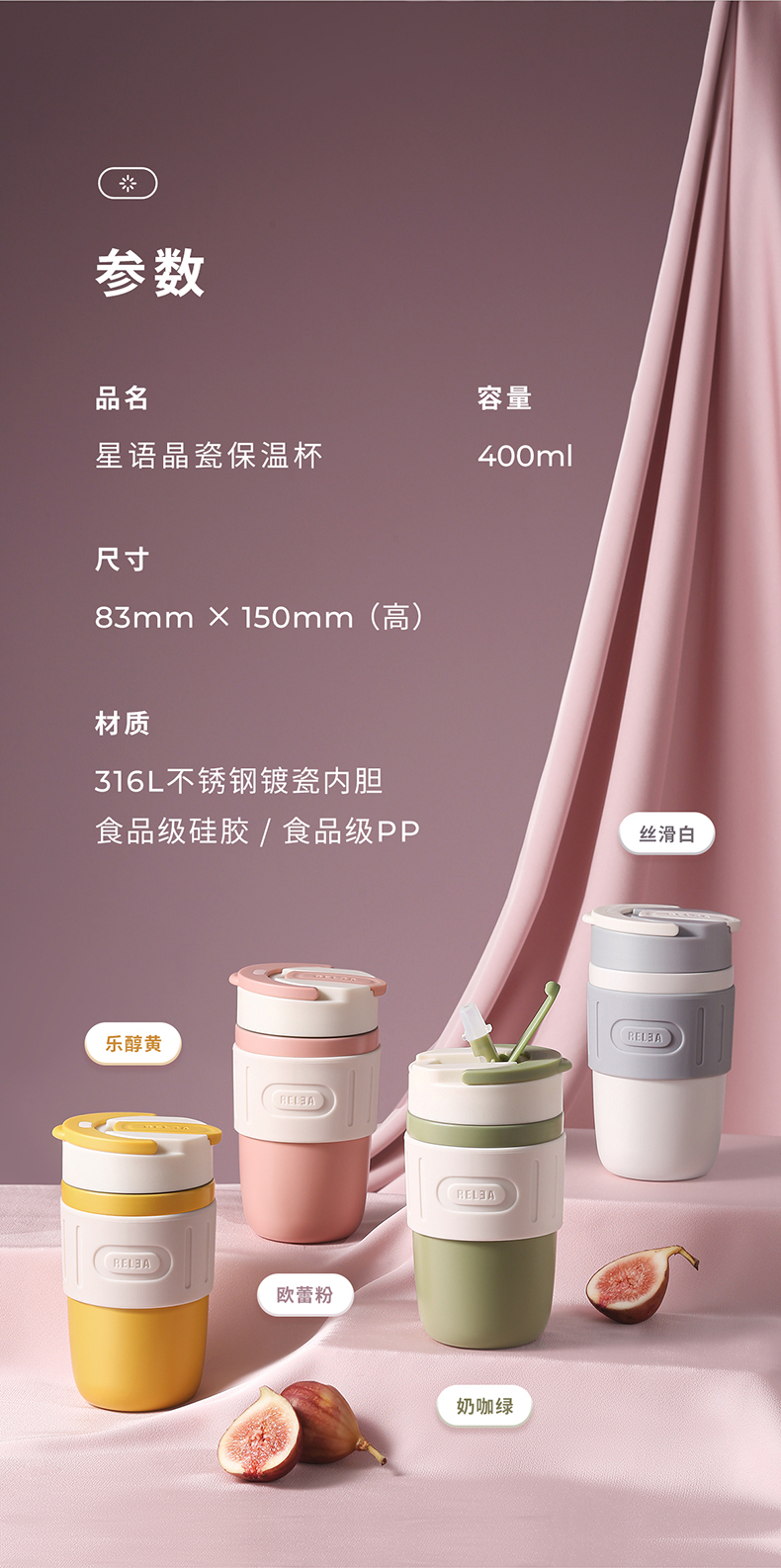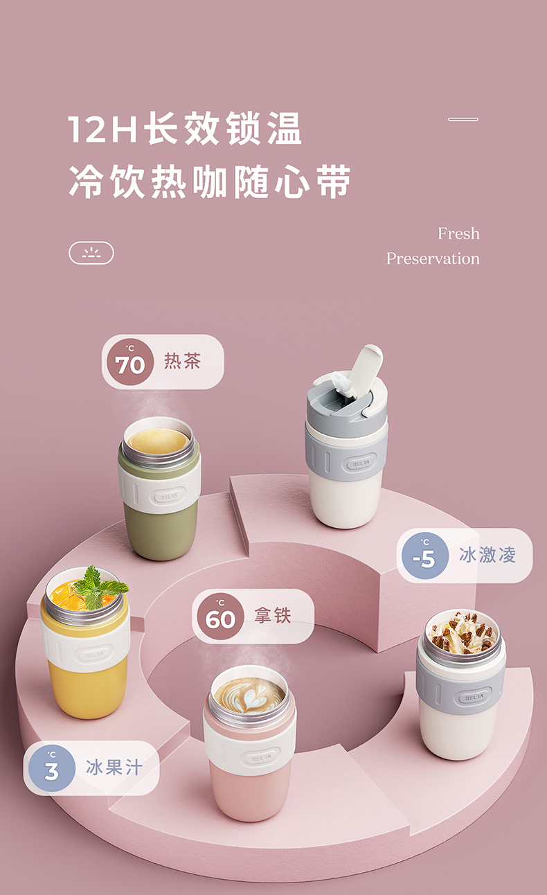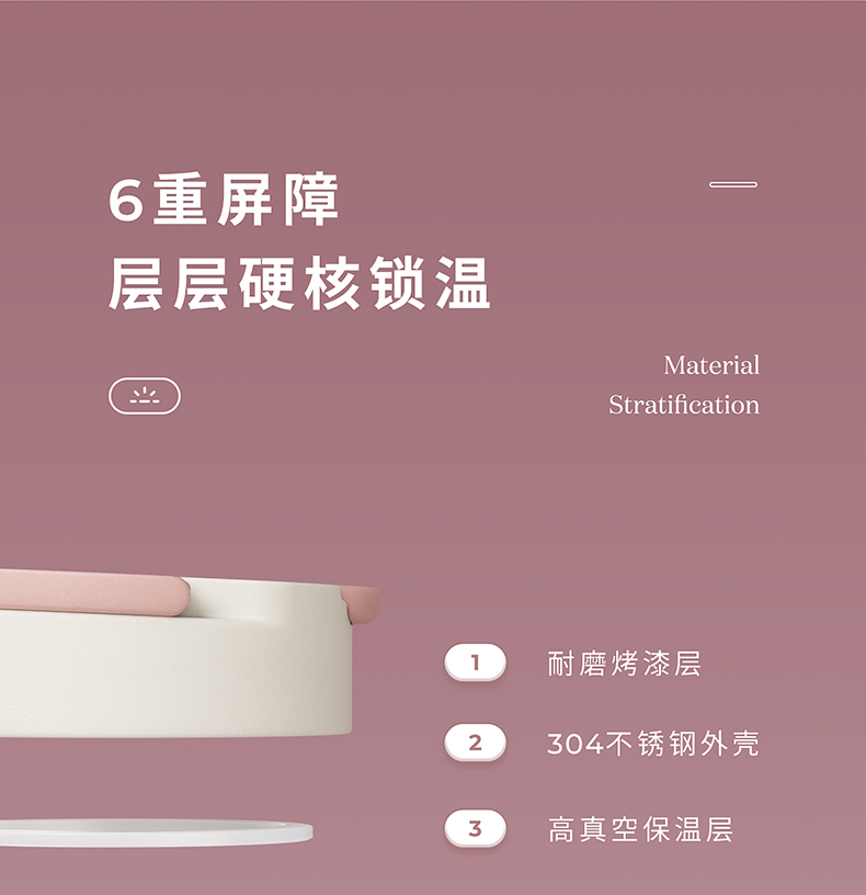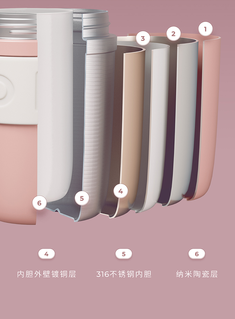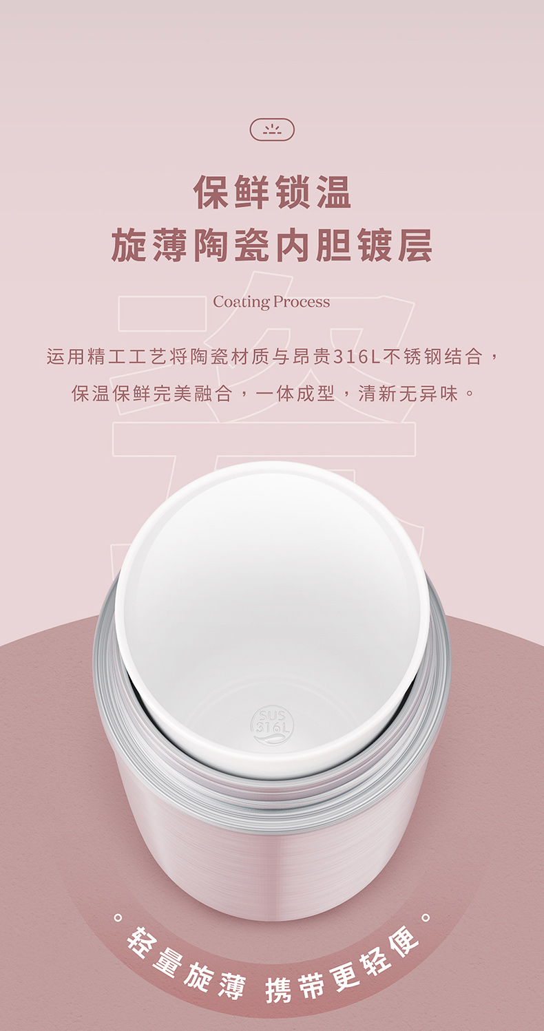 这款 316不锈钢保温杯,双层真空保温,内胆在316L不锈钢基础上镀上一层旋薄晶瓷,一体成型,清新无异味,耐酸耐碱,不留茶垢,保温保鲜完美融合。