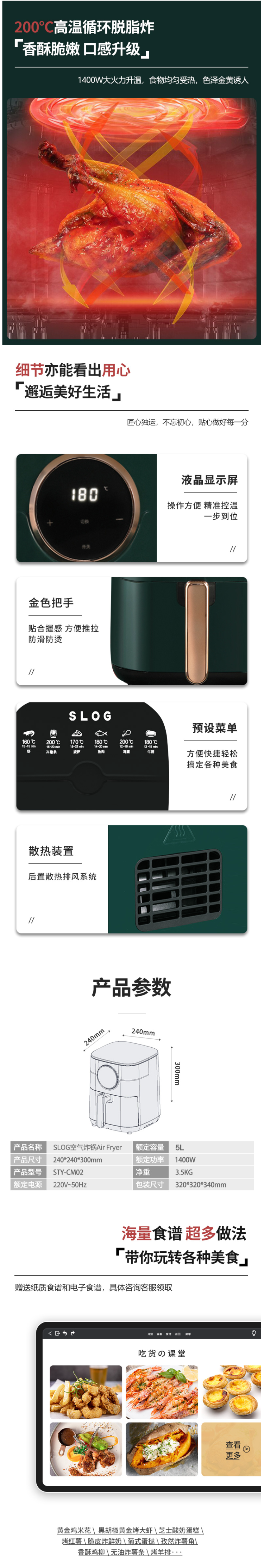 这款Slog STY-CM01空气炸锅,特点是5L超大容量,一般的空气炸锅只有2L。使用液晶触控,操作更方便,还拥有5大智能便捷菜单。