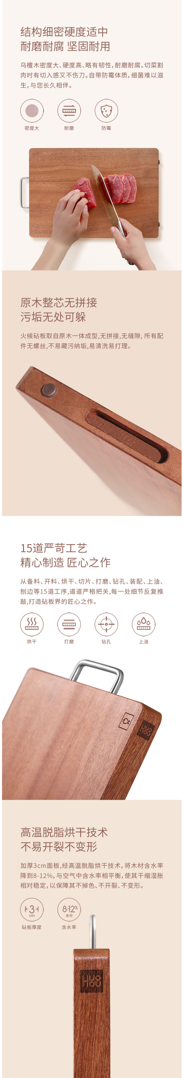 这款火候砧板选用非洲进口乌檀木的木心制作,其结构细腻、纹路均匀、色泽光亮,制成的砧板具有古朴的质感,经久耐用,整木无拼接、无缝隙,所有的配件无螺丝,不易藏污纳垢,易清洗,易打理。