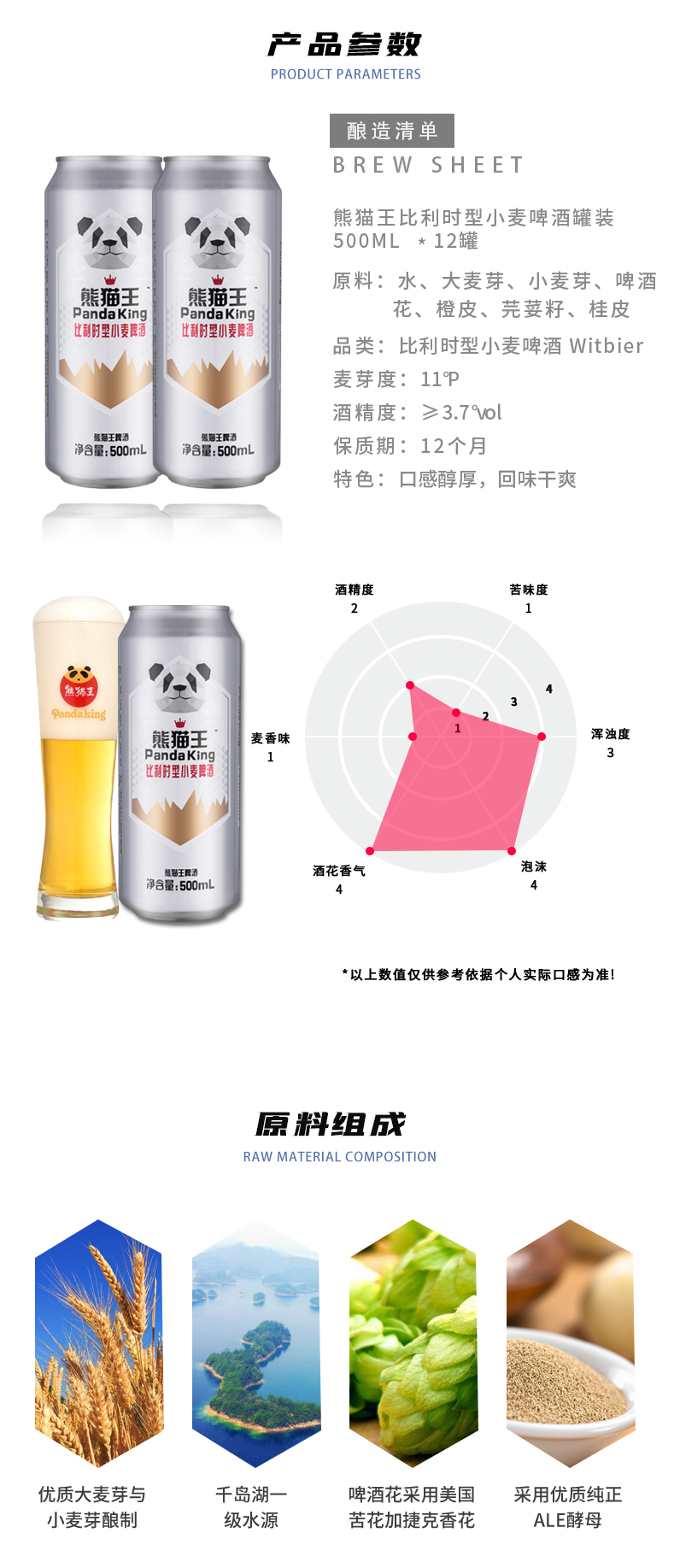 采用千岛湖国家一级水源,啤酒花采用美国苦花加捷香花,比利时Ale酵母发酵,大于40%比例小麦酿制,麦汁浓度11°P,酒精度≥3.7% Vol,特点鲜明,酵母、小麦蛋白、天然香料漂浮在酒液中,口感非常醇厚,喝下之后回味干爽。