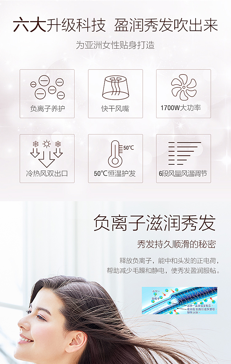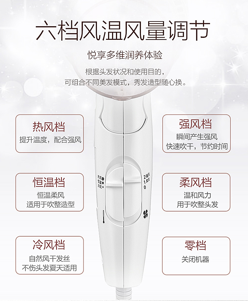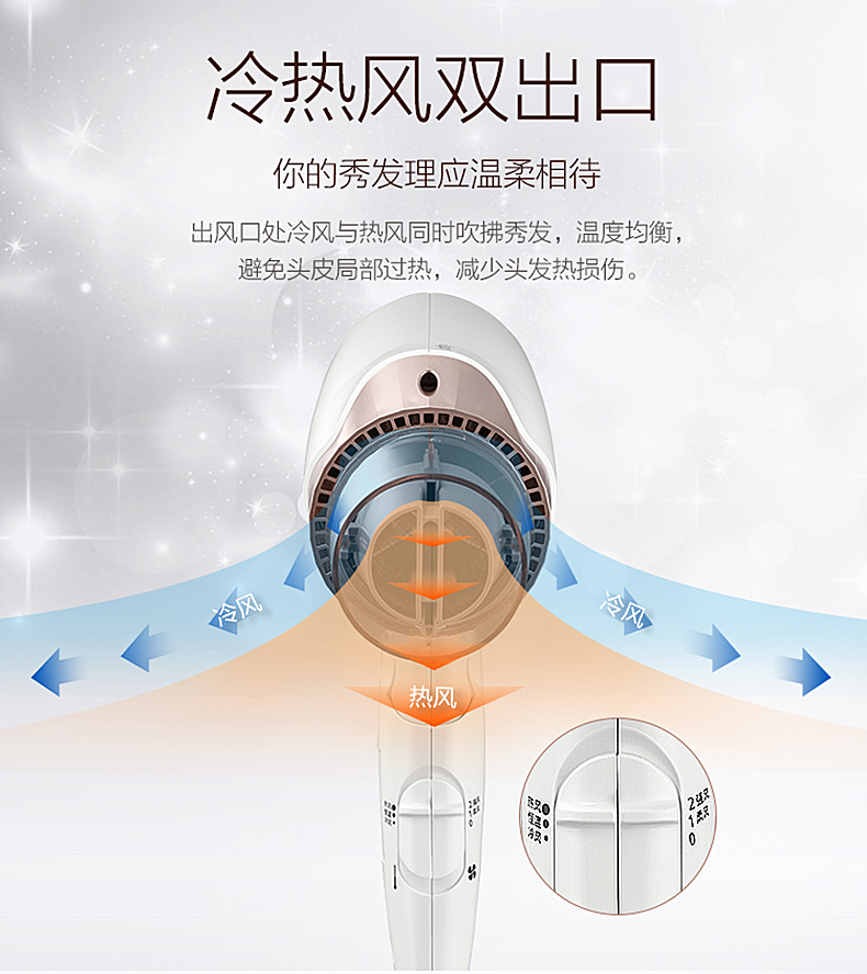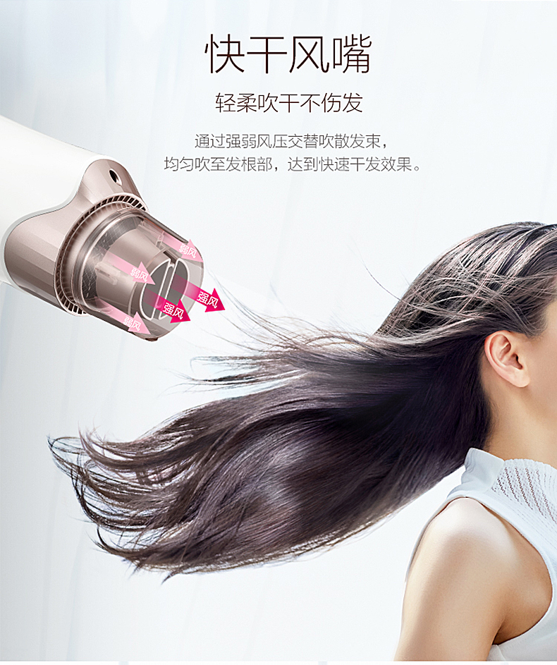 1700W大功率,带50℃恒温功能,冷热风双出风口同时吹拂秀发,避免局部过热,减少头发受热损伤,在搭配快干风嘴,通过强弱风压交替吹散发束,均匀吹至发根,达到速干的效果,3种温度,3种风量可选,满足不同使用需求。人体工程学设握柄,轻松易握,可折叠可悬挂,方便易收纳。