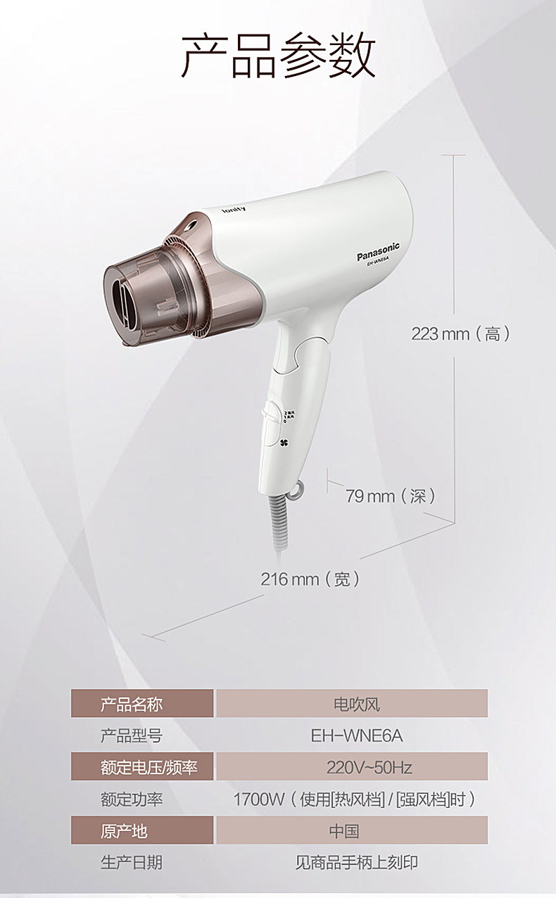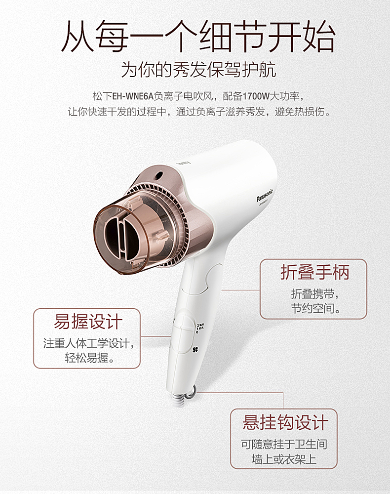 Panasonic松下电吹风拥有很好的口碑,网上多家媒体的实测效果,松下都优于戴森、飞利浦和博朗。这款松下 EH-WNE6A 恒温负离子吹风机,带负离子功能,能够和头发中的正电荷,帮助减少毛躁和静电,使头发盈润服帖。