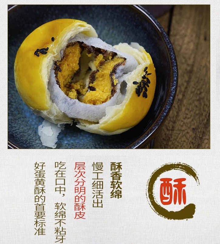整体选材采用进口新西兰安佳黄油+荔园海鸭蛋+优质红豆+Q弹麻薯皮。20天常温无氧短保锁鲜!色泽金黄,皮薄馅多。