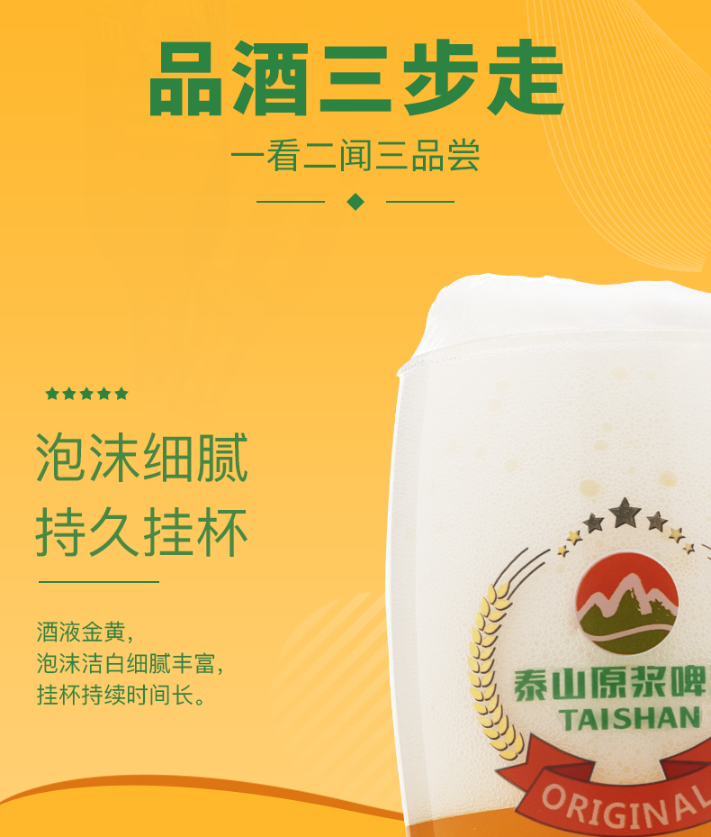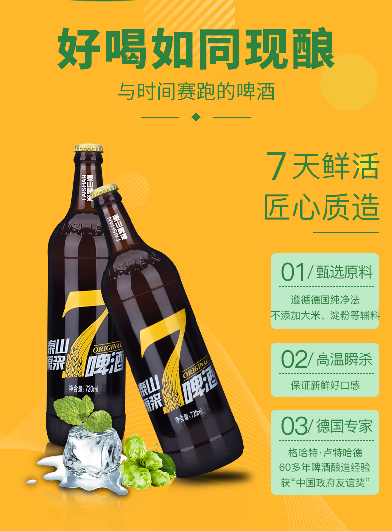 这款泰山啤酒 8°P 7天原浆啤酒,720ML大瓶装装,使用德国设备和发酵工艺,精选澳洲大麦、新疆啤酒花、德国上面酵母及泰山地下水酿造而成,酒精度≥2.5%vol,原麦汁浓度8°P,未经过滤,保留酵母,好喝如同现酿,口味纯正干爽,泡沫丰富。