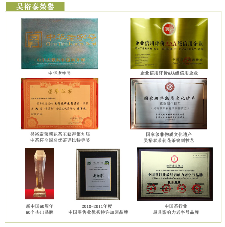 始创于1887年,由吴裕泰茶栈、吴裕泰茶庄演变、发展而来,至今已有120余年的历史。分店遍布北京的大街小巷,是国家商务部首批认定的“中华老字号”。2019年11月,《国家级非物质文化遗产代表性项目保护单位名单》公布,北京吴裕泰茶业股份有限公司获得“花茶制作技艺(吴裕泰茉莉花茶制作技艺)项目”保护单位资格。