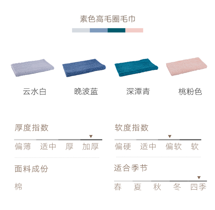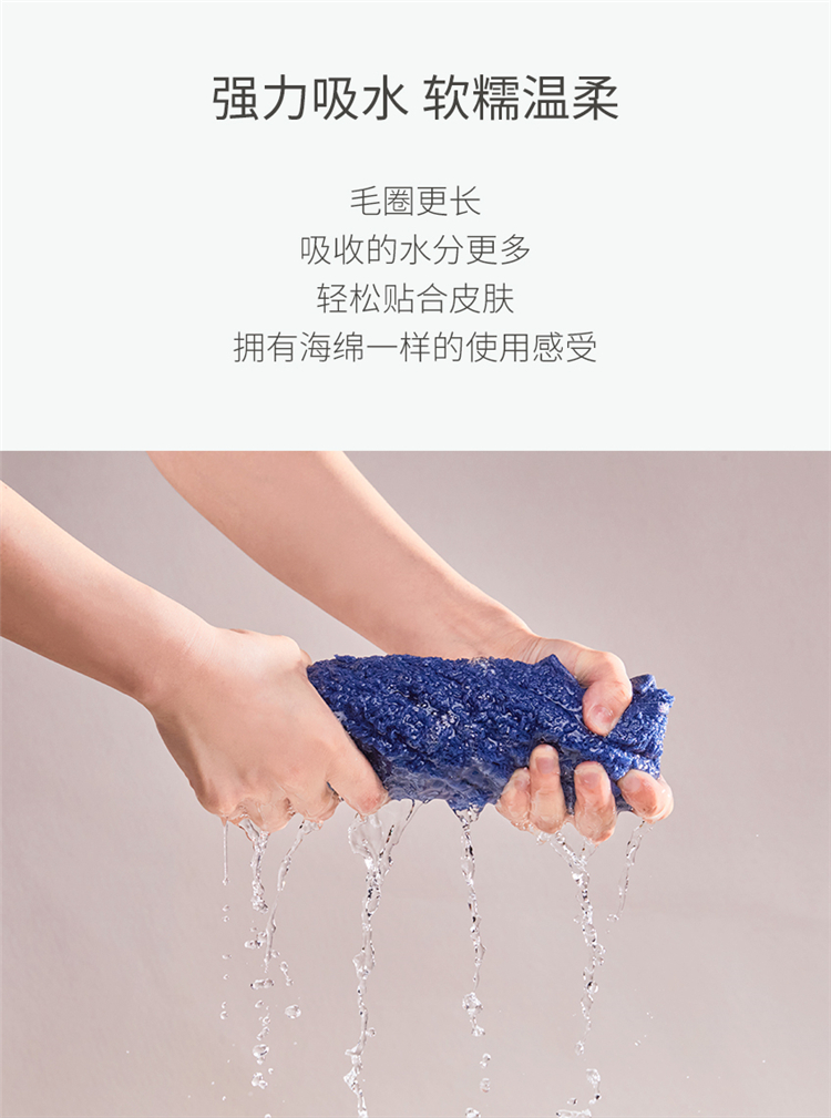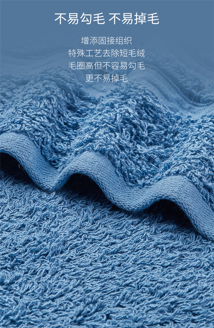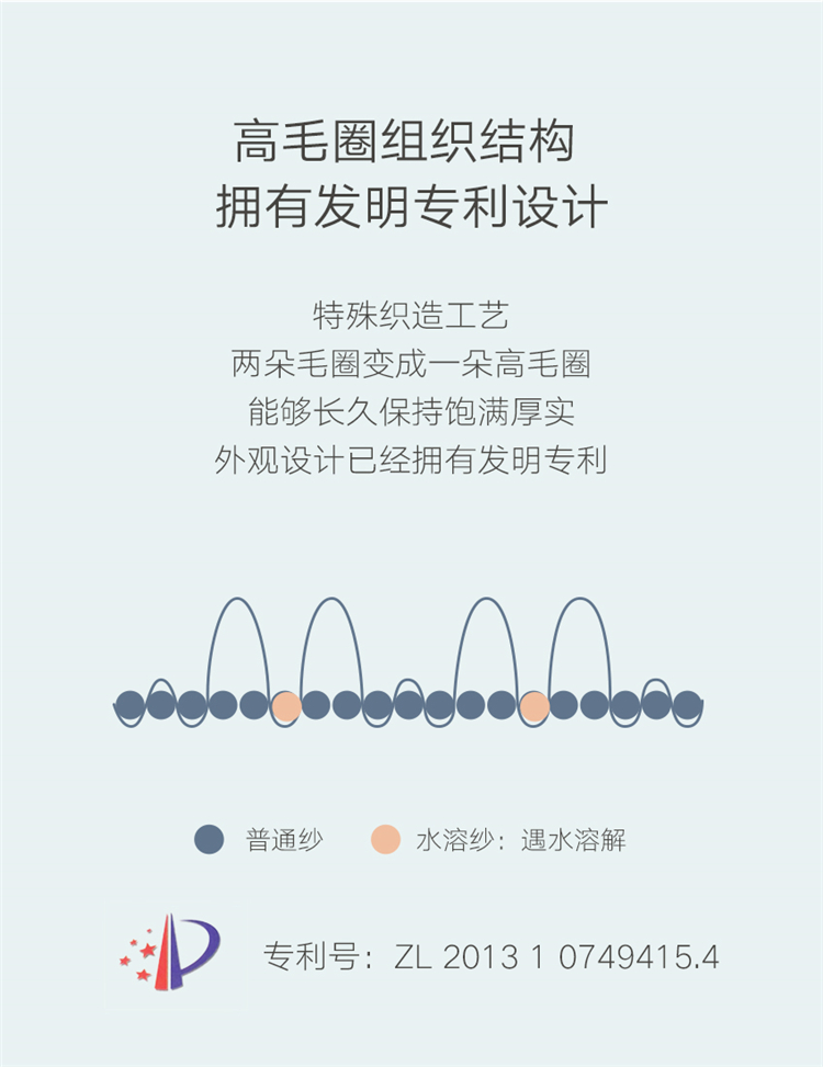 外观设计发明专利,高毛圈组织结构。面料甄选新疆精梳棉纱,纤维柔长,触感柔软,特殊织造工艺,两朵毛圈变成一朵高毛圈,去除短毛绒,增添固接组织,不易勾毛不易掉毛,够长久保持饱满厚实,强力吸水,拥有海绵一样的使用感受,