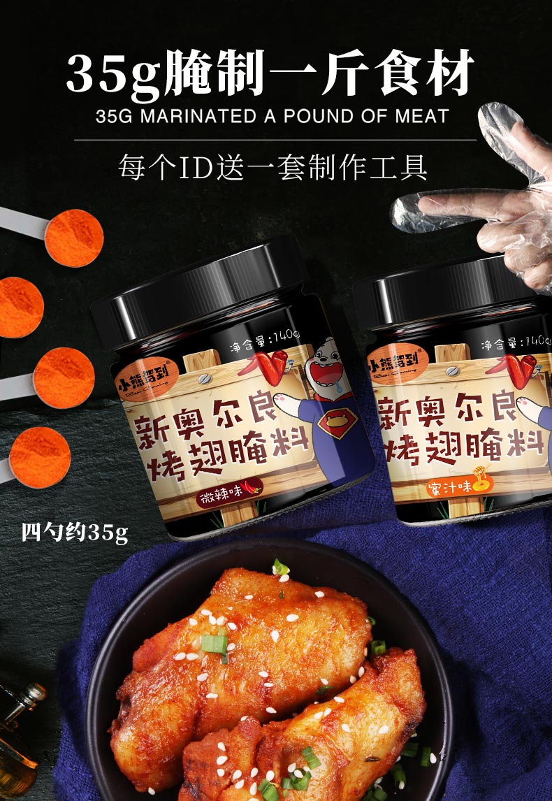 蜜汁+微辣 不接受备注。有67万的4.9分好评,1罐蜜汁+1罐微辣,新奥尔良烤翅腌料,粉料细腻,kfc风味,精选原材料,两种口味,罐装方便留存。