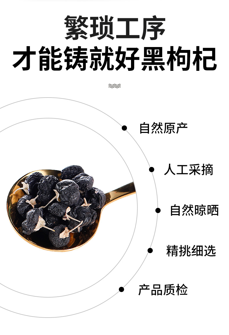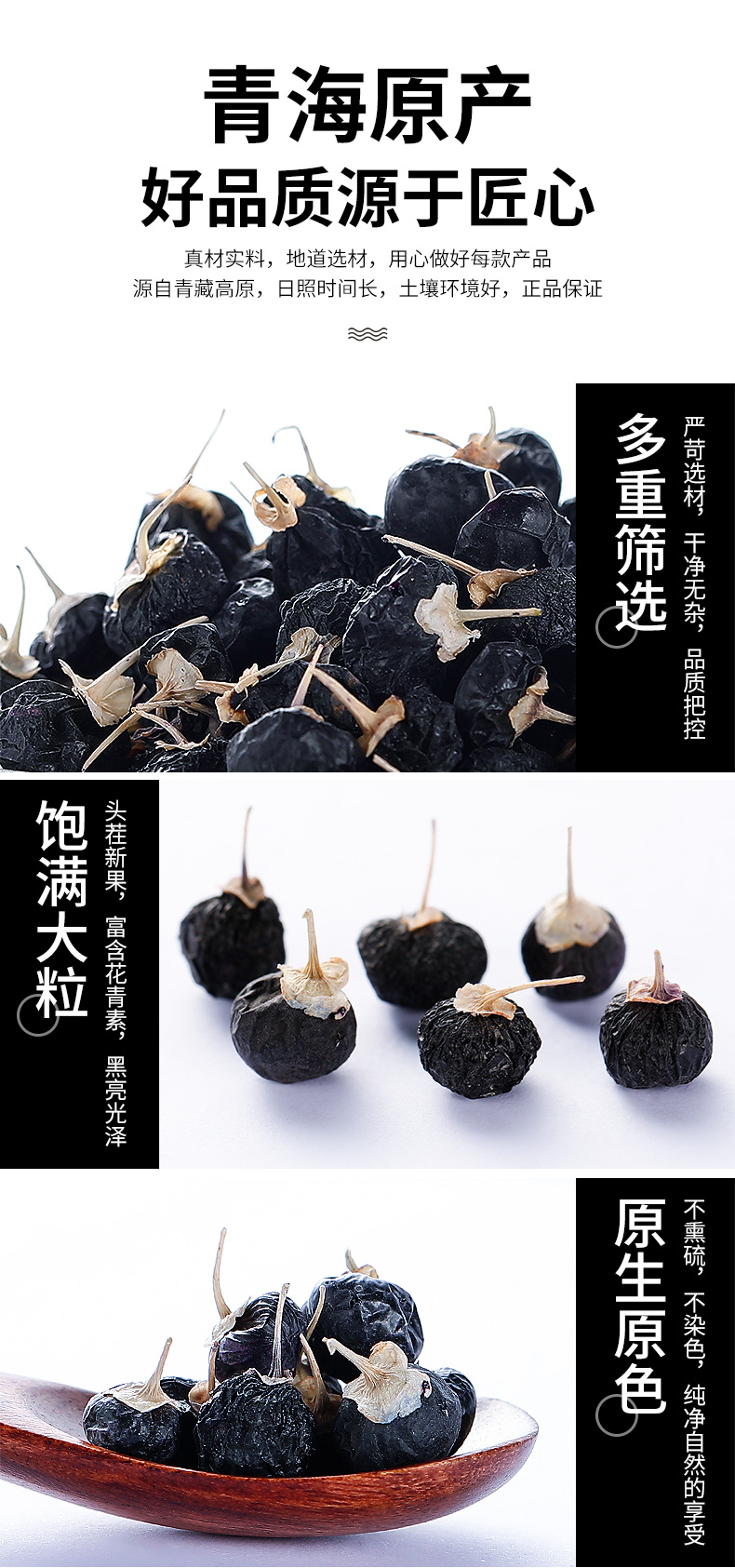 野生黑枸杞味甘、性平,富含蛋白质、脂肪、糖类、游离氨基酸、有机酸、矿物质等多种有机成分,其钙、铁、尼克酸含量分别为红果枸杞的2.3、4.6、16.7倍,尤其是原花青素超过蓝莓(这是迄今为止发现原花青素含量最高的天然野生果实,也是最有效的天然抗氧化剂。