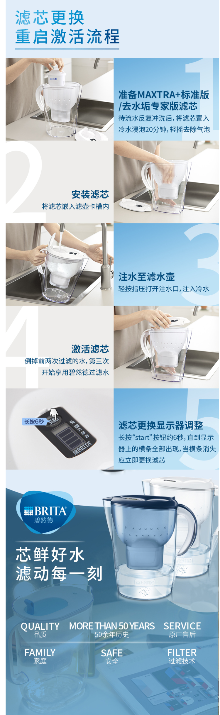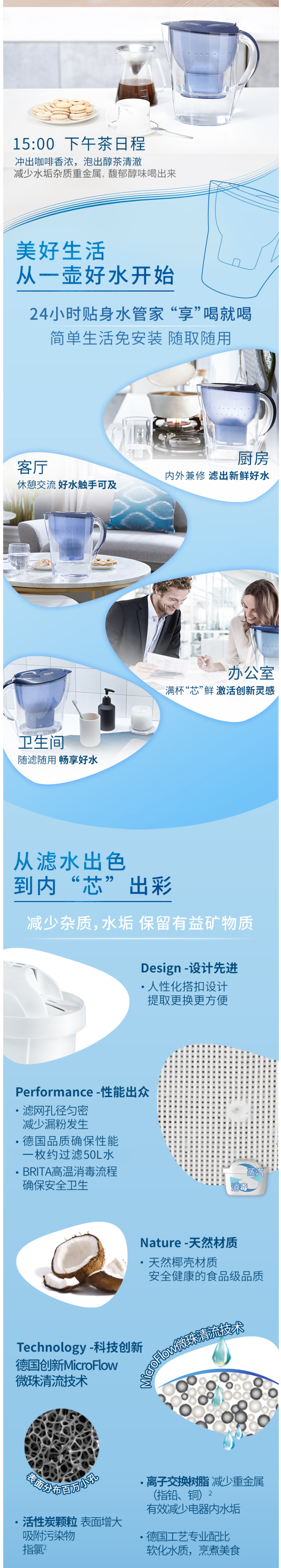 滤芯方面,德国原装进口的Maxtra+,比传统的一代滤芯在过滤能力方面增加了20%,还改良了MicroFlow Technology 微流控技术,使水的味道比以往更好。滤芯中所含的活性炭,能有效过滤水中的重金属、水碱、杀虫剂、有机杂质、氯气和异味。