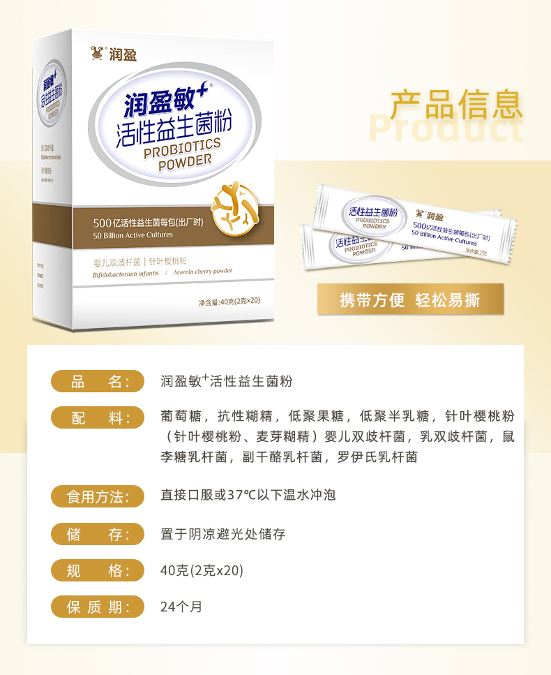 这款润盈敏500亿益生菌冻干粉,富含五种益生菌—副干酪乳杆菌、婴儿双歧杆菌、罗伊氏乳杆菌、乳双歧杆菌、鼠李糖乳杆菌,成人儿童通用。