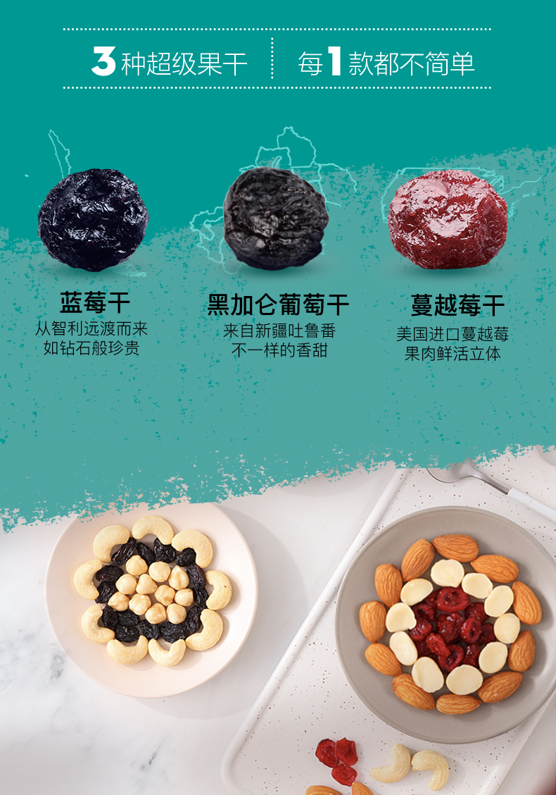 优选多款坚果、果仁6:3科学配比,精准控制水分,坚果口感酥脆、果干口感温润自然,食材效果呈现更佳,包含:蔓越莓干、核桃仁、腰果仁、扁桃仁、南瓜子仁、蓝莓干、榛子仁、夏威夷果仁8款热销坚果/果仁,不添加色素、香精,蕴含多种自然营养,满足一日学习、生活能量所需。规格为750g,内有30小袋独立包装。