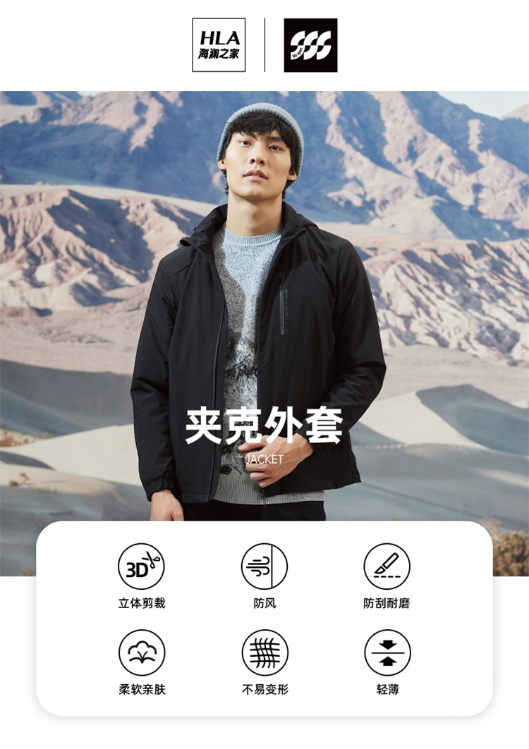 海澜之家这款是防风保暖夹克,使用近两年流行的复合面料,外层的是高密度防风面料,防风的同时也防泼水;里面是抓绒保暖材质,里外两层结构紧密交织在一起。