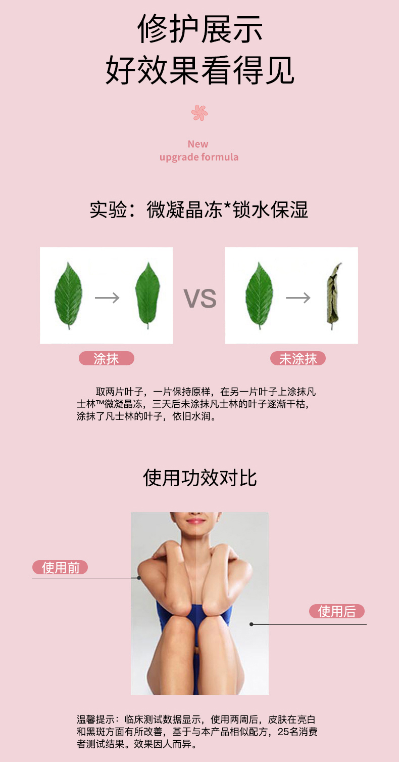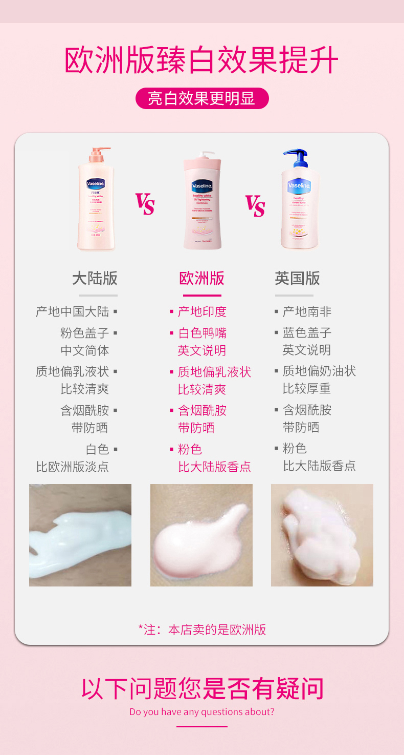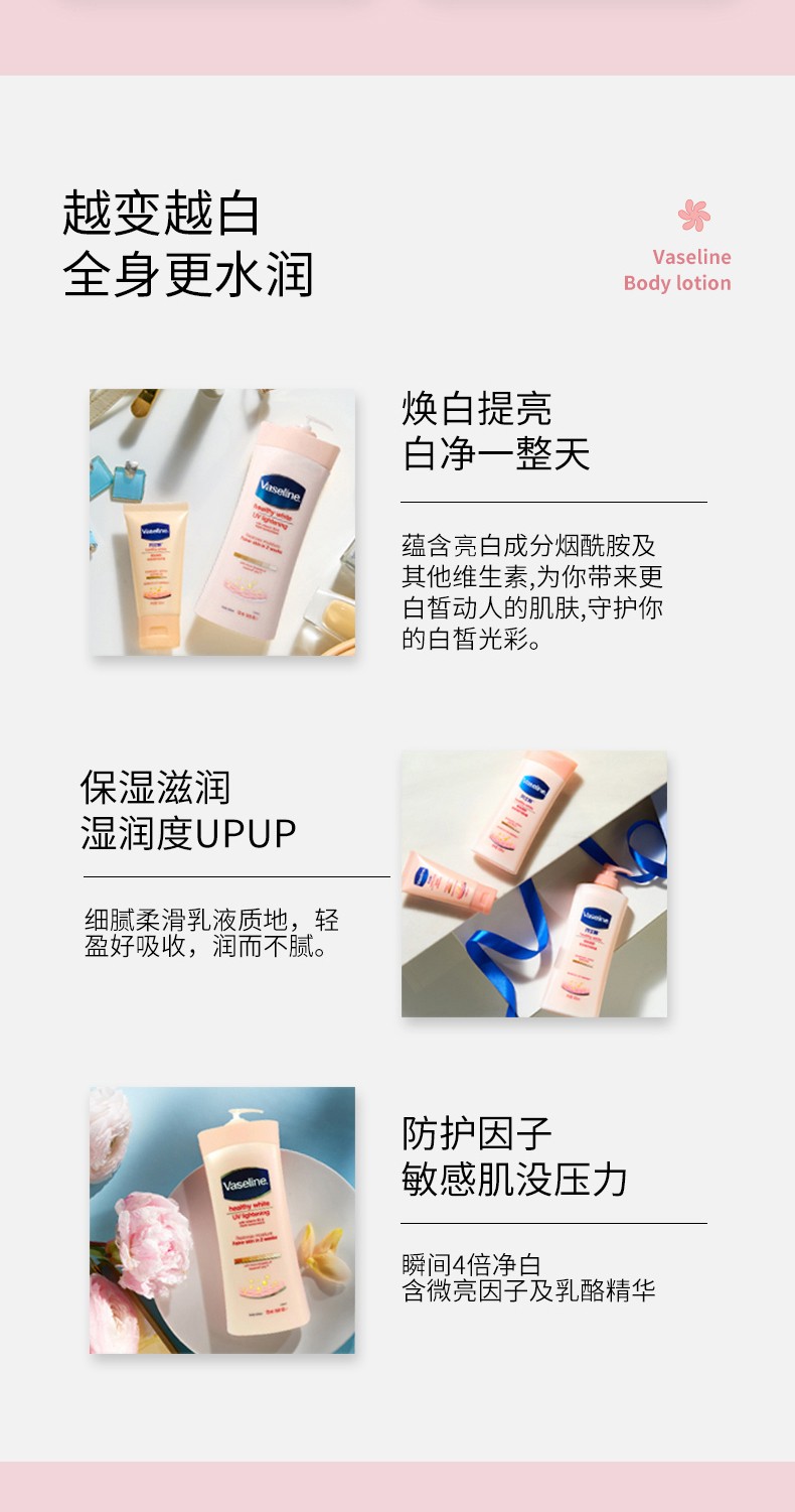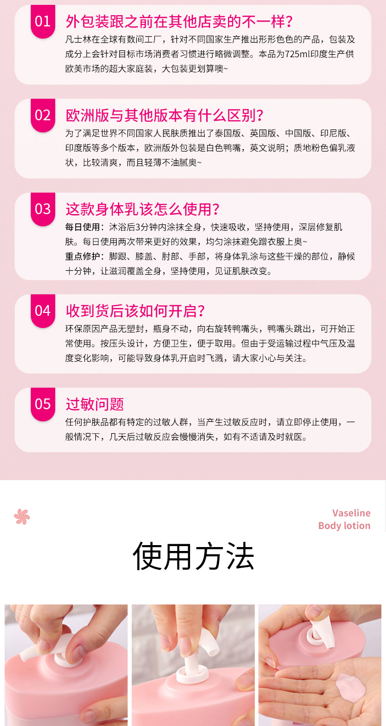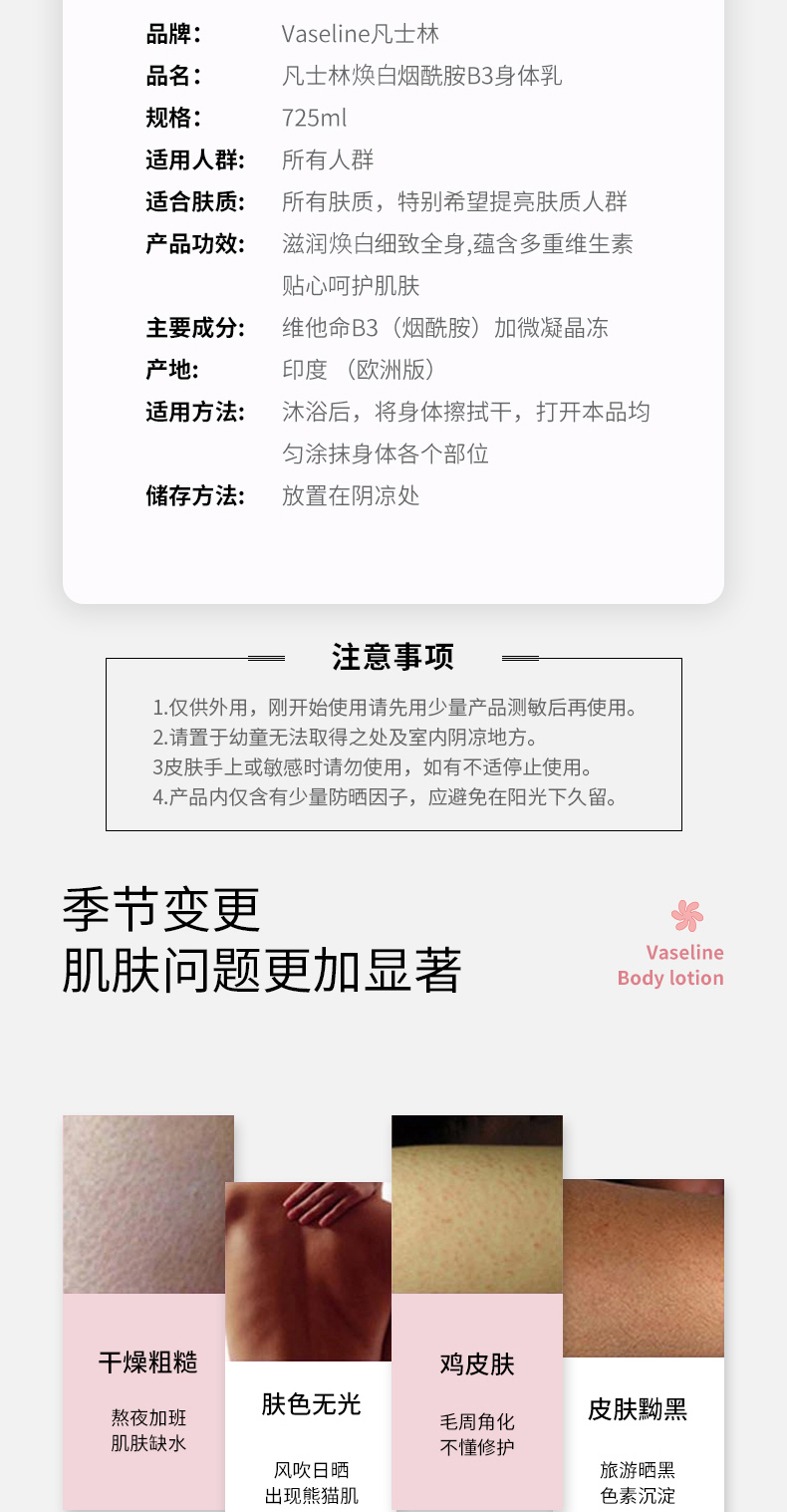 凡士林身体乳,全球著名的保湿产品,采用经典配方,对于干燥肌肤、老废角质均有针对性效果,促进肌肤自愈。新版质地较为轻薄,容易涂抹,依然安全有效,适合干性及中性肌肤,官方建议在沐浴后3分钟内使用。