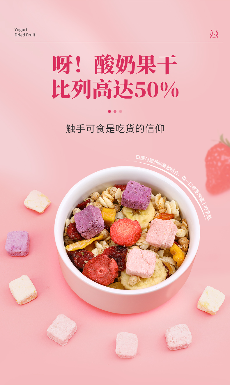 分别是:冻干黄桃酸奶块、冻干蓝莓酸奶块、冻干草莓酸奶块、香蕉片、蔓越莓片、燕麦片、冻干草莓片、芒果丁、椰蓉、谷物球、南瓜子仁、红葡萄干、木瓜丁、谷物脆。