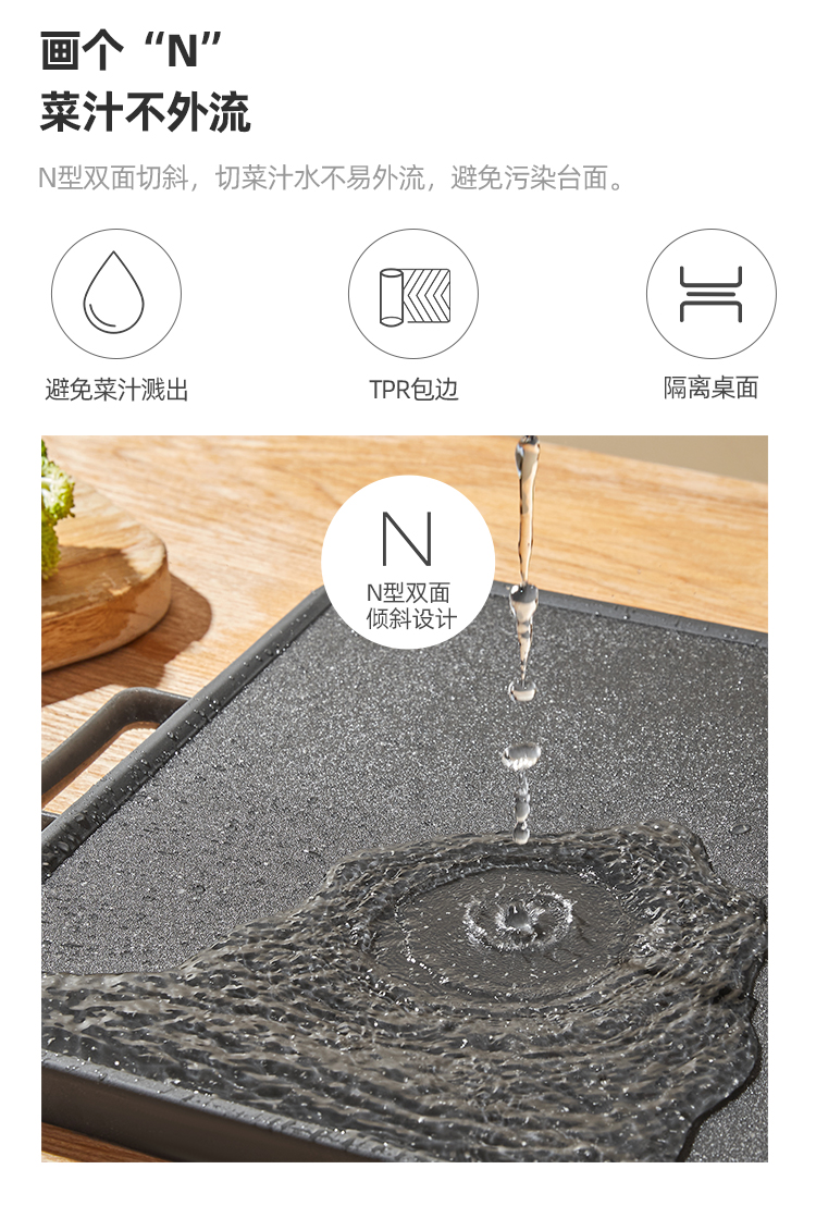 这款是第二代的加厚款,相比于初代,第一是变成了双面,正面304不锈钢、反面PP材质,中间加了一层木板材质,更厚更实用;第二是周边增加了一圈TPR橡胶,使菜板不与台面直接接触,更卫生,同时汁水不易外流。
