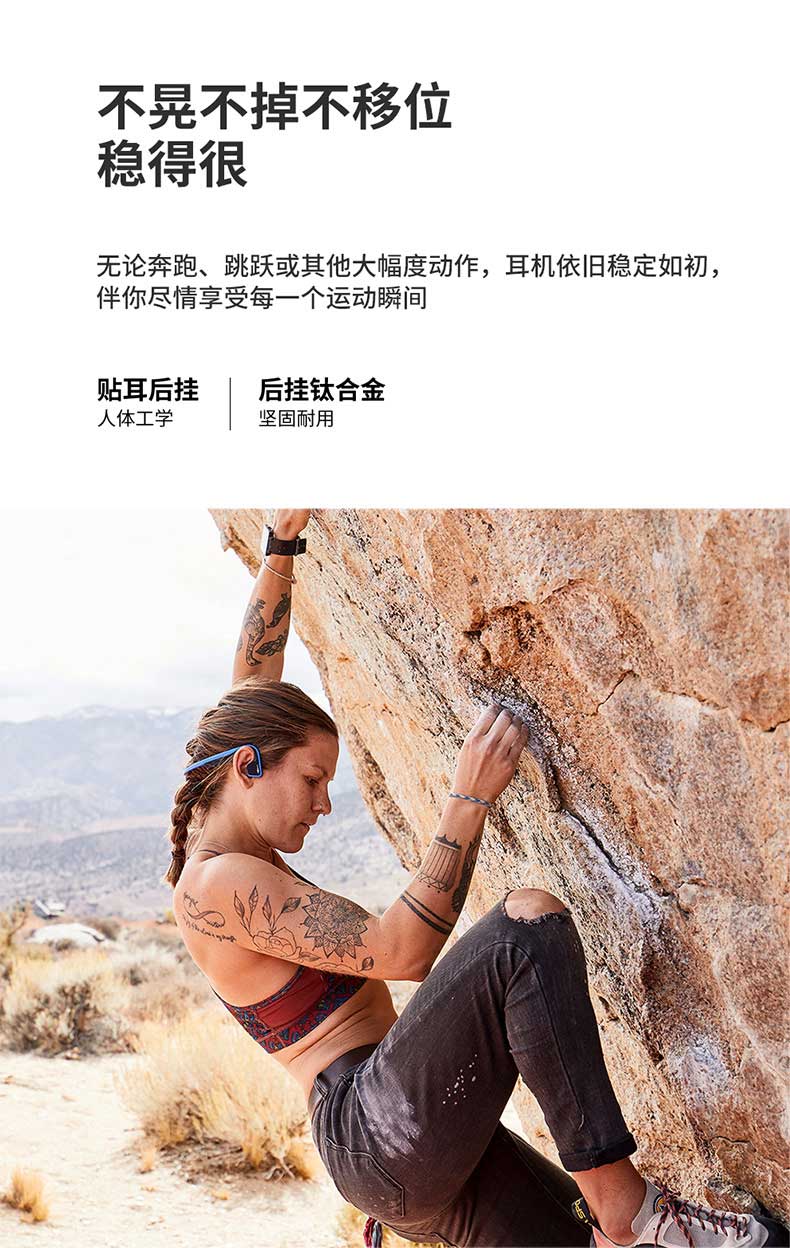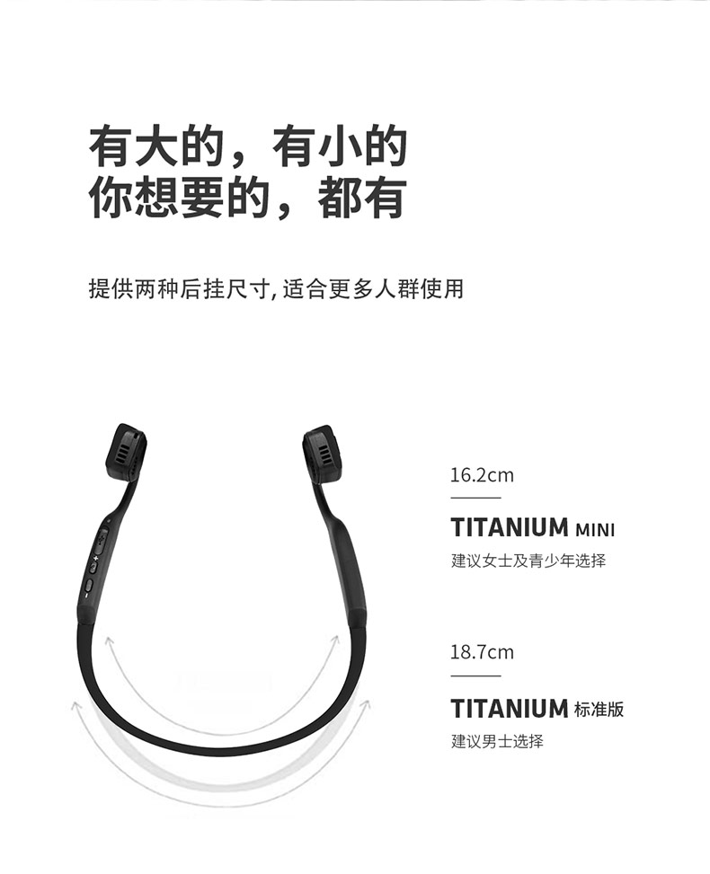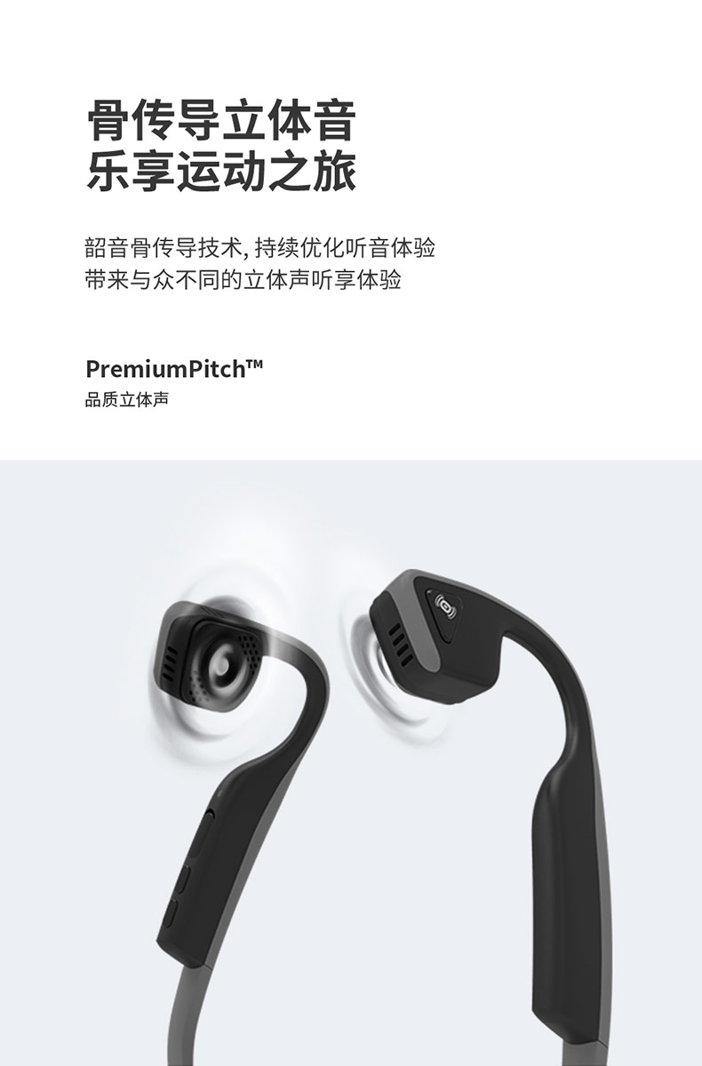 人体工程学U型后挂式设计,在激烈运动中也可稳固不移位,使用起来更舒心更安心。后挂钛合金耳机框架,经过10000次弯折测试,任意拉伸不变形,无孔漏音技术,长条形结构扬声器增加贴片面积,30°倾斜技术,有效降低了震动困扰,使得低频更细腻,减低了骨传导耳机的漏音尴尬。