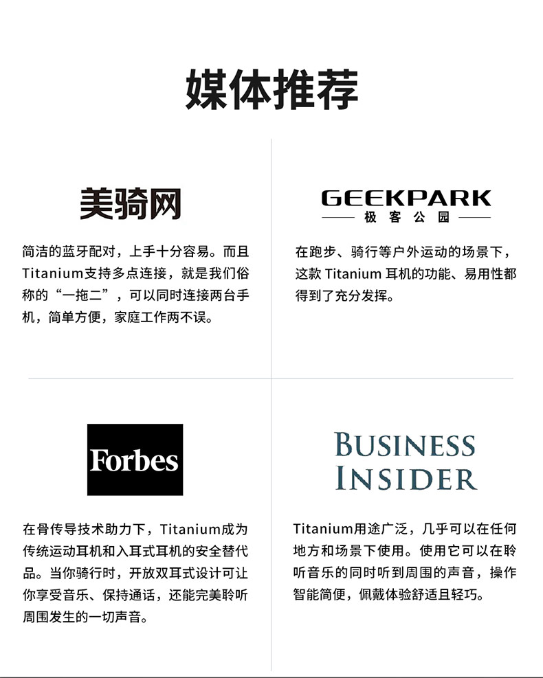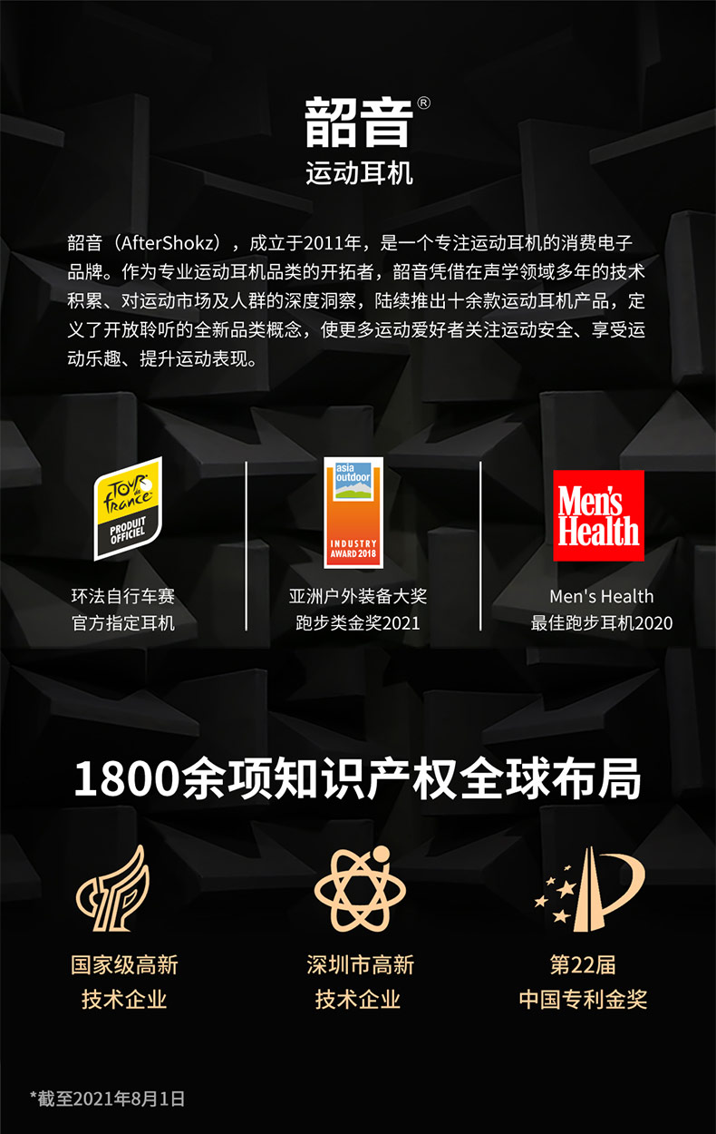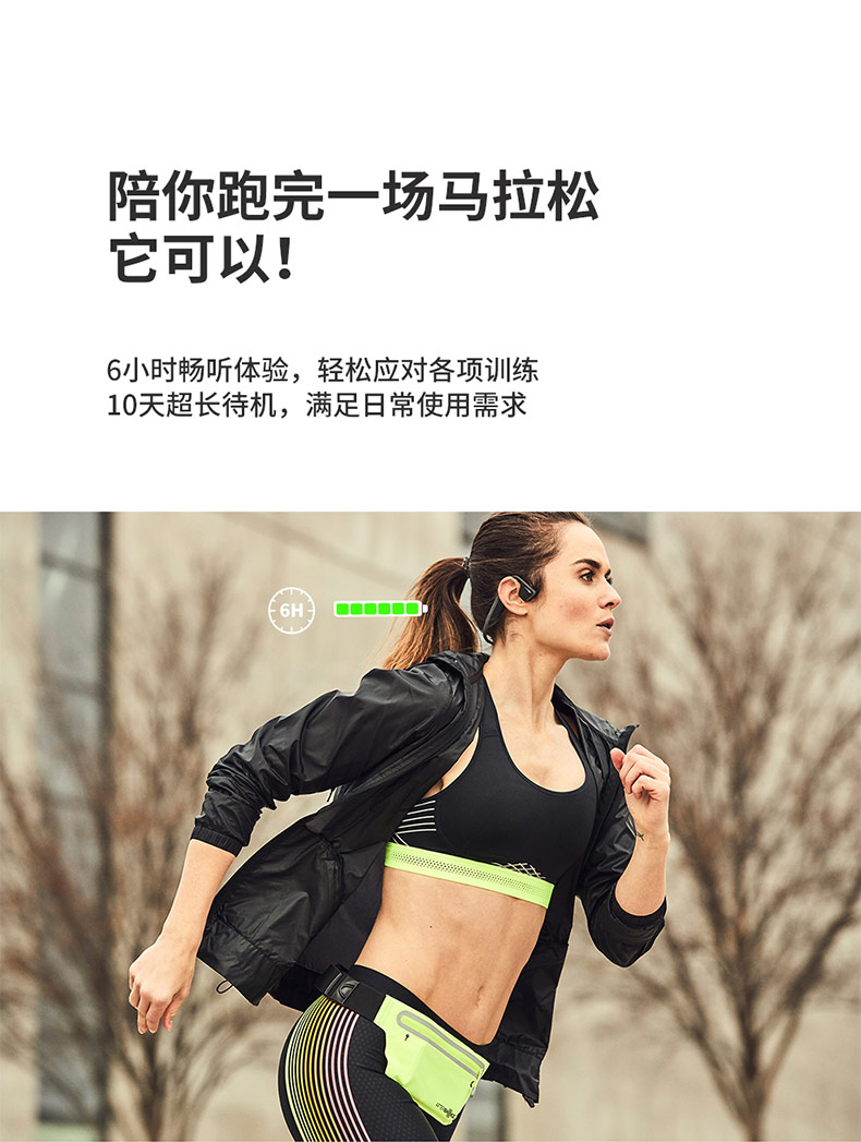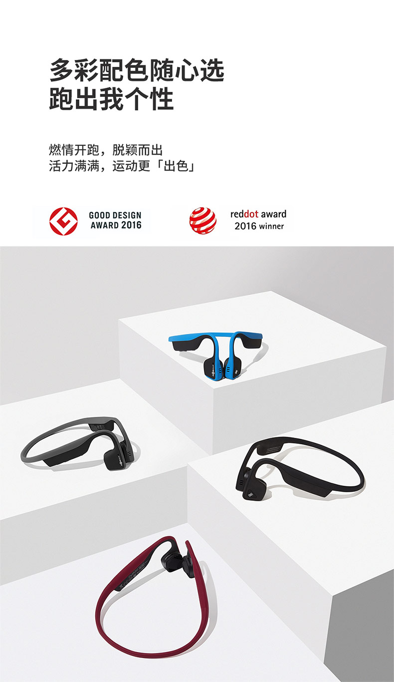 人体工程学U型后挂式设计,在激烈运动中也可稳固不移位,使用起来更舒心更安心。后挂钛合金耳机框架,经过10000次弯折测试,任意拉伸不变形,无孔漏音技术,长条形结构扬声器增加贴片面积,30°倾斜技术,有效降低了震动困扰,使得低频更细腻,减低了骨传导耳机的漏音尴尬。