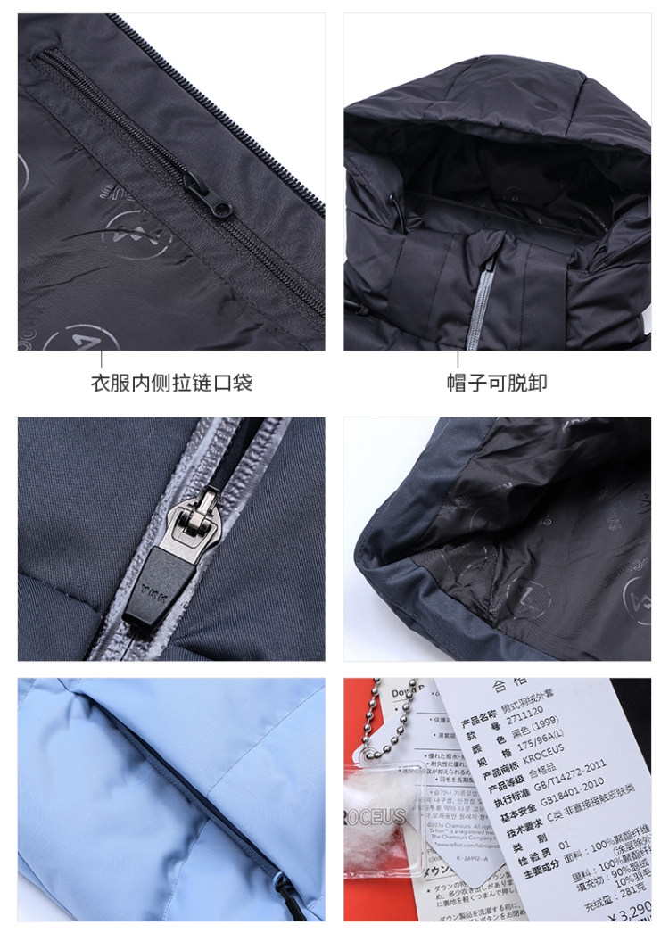 大高立领设计,帽子可拆卸,主拉链是YKK的,拉链顶部采用保护套止锁设计,防止拉链拉的太快时夹到脖子。