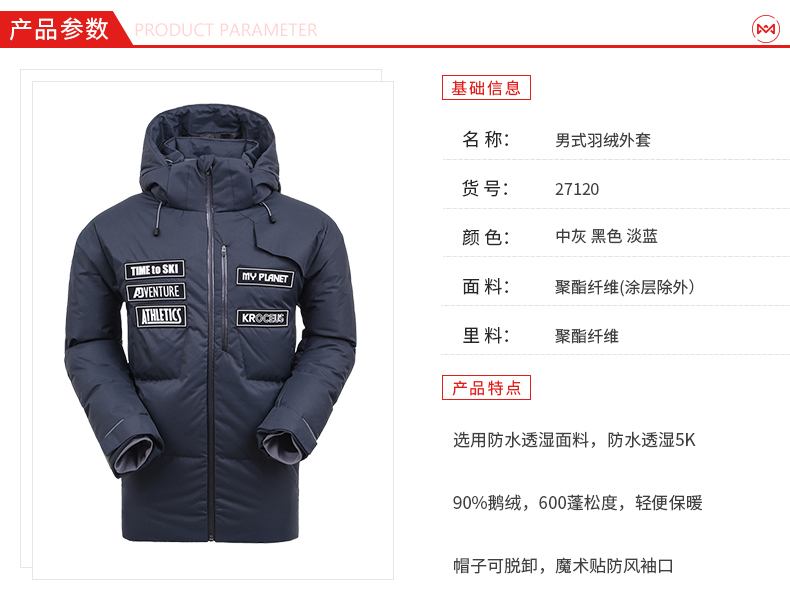 这款羽绒服是地球科学家的旗舰款,为冬季滑雪设计,滑雪服都需要防水,所以外层是防水的冲锋衣面料,男款L码充绒量高达281克,超级厚实保暖。