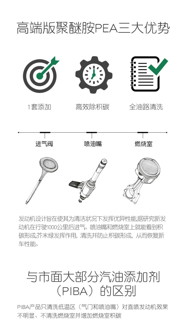 芥末绿与市面上普通的燃油添加剂相比,使用了PEA(聚醚胺),可同时清洁气门、喷油嘴和燃烧室,清洗比较彻底,同时价格也比较高,不过使用后能明显看到效果,适用于市面上全部汽油车辆(注:柴油车不能用)。