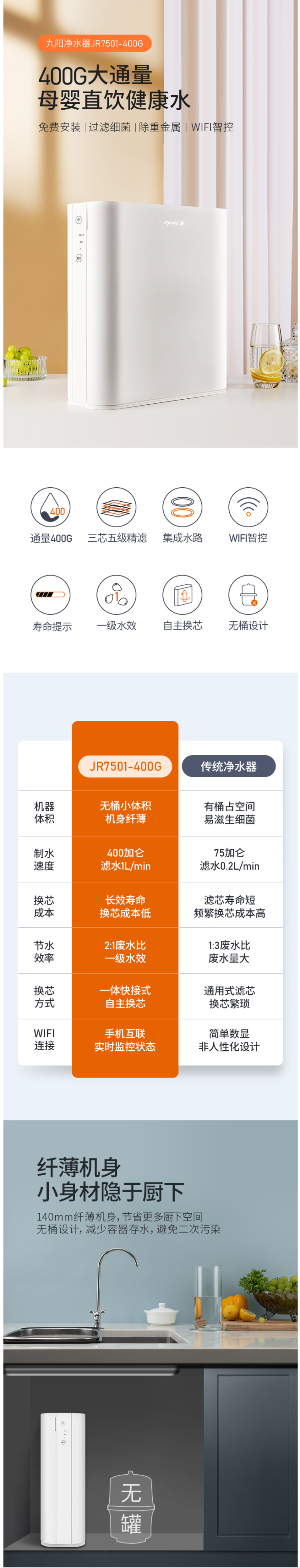 这款九阳JR7501 RO反渗透直饮净水器,是19年的新品,拥有5级精滤,升级版13寸加长滤芯,比普通的8寸滤芯,使用寿命更长(延长了一倍),净水量也更多。