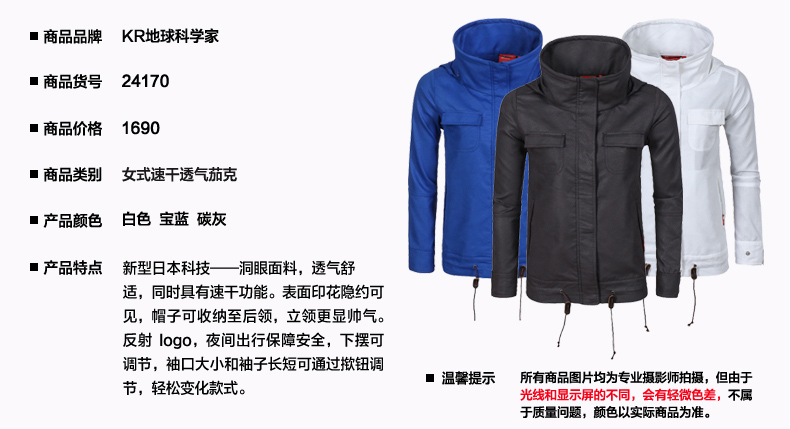 这款地球科学家速干透气印花夹克,使用新型日本科技洞眼面料,透气舒适,同时具有速干功能。表面印花隐约可见,下摆两侧采用松紧带,穿着更服帖,细节点缀荧光色,点亮了整款设计,全YKK拉链。