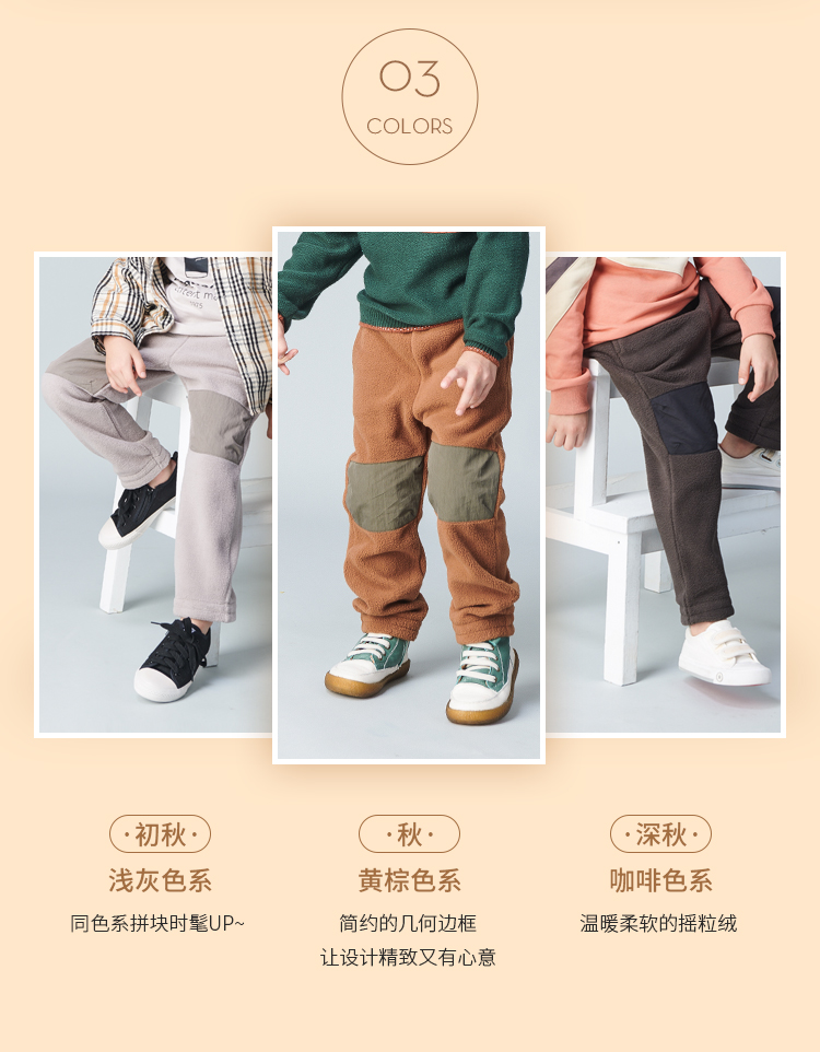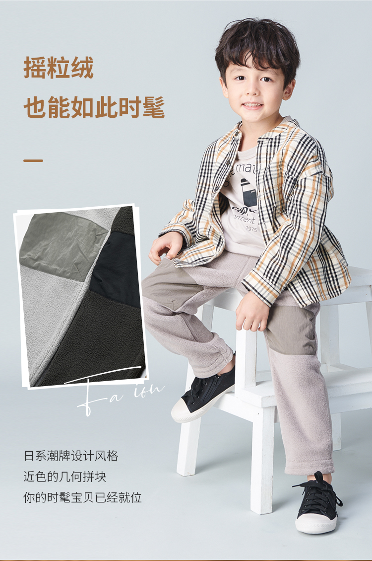 3色可选,90~140码全。日本超高人气童装品牌,日系男童拼接摇粒绒裤子,温暖触感,不易褶皱,几何拼块,膝盖处抗磨损,A类品质,穿着舒适百搭。