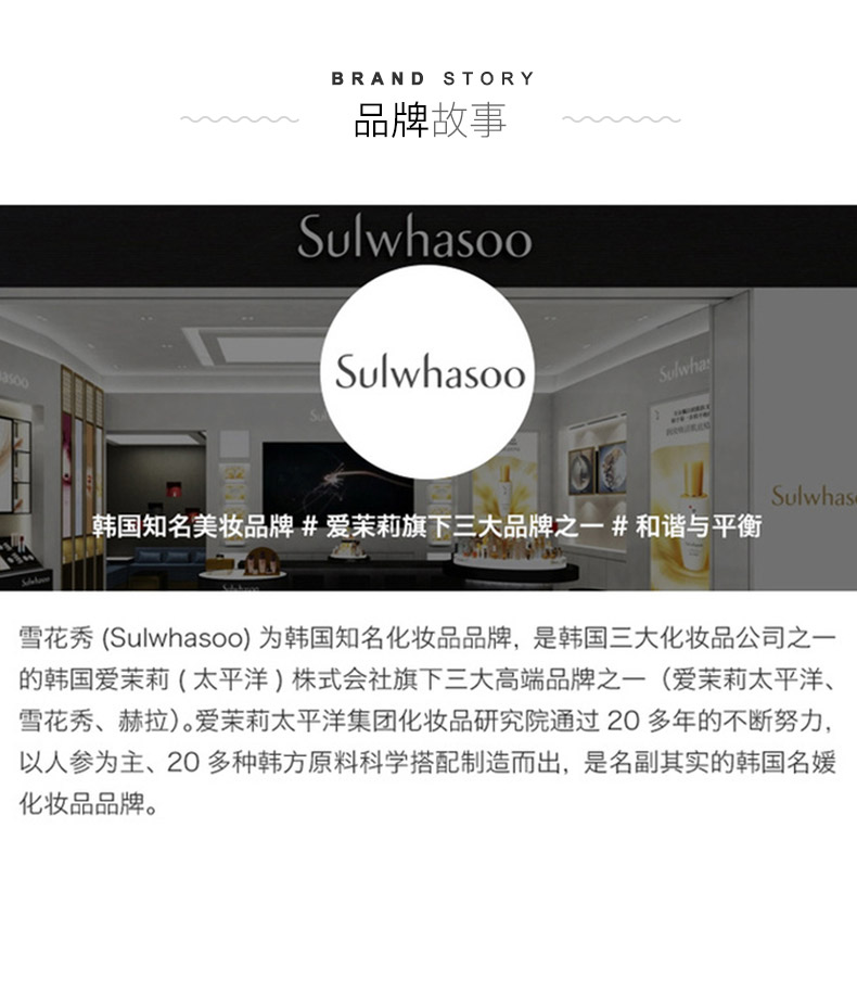 雪花秀是韩国爱茉莉(太平洋)株式会社旗下三大顶级品牌之一(爱茉莉太平洋、雪花秀、赫拉)。通过20多年的不断努力,以人参为主、20多种韩方中药材科学搭配制造出的一款抗皱、抗老化非常明显的化妆品之一,是名副其实的韩国顶级化妆品品牌。