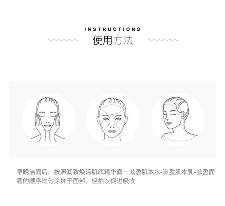 滋盈肌本平衡滋养乳液:质地柔滑细腻,亲肤延展性好,特别适合干燥肌肤使用。日常用清新柔和的乳液涂抹于肌肤后能迅速被吸收。给肌肤提供丰富的营养和滋润成份,缔造丝般柔滑的肌肤质感。