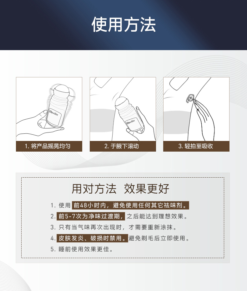 使用方法:1 将产品摇晃均匀、2 于腋下滚动、3 轻拍至吸收。