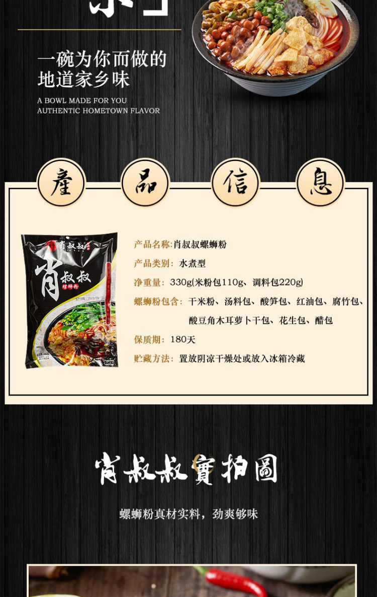 这款肖叔叔 螺蛳粉330g*3袋,手工做成纯正米粉,无添加,劲道足,非油炸,高温熟化,每一锅螺蛳粉的堂弟都是由新鲜螺蛳、走地老母鸡、鸡骨架、搭配20多种香料熬制而成,辣油采用上号的朝天椒制成,酸笋由山泉水老坛浸泡,炸腐竹色泽黄白,油光透亮,口感独特,七大配料,酸辣鲜爽,回味醇厚。