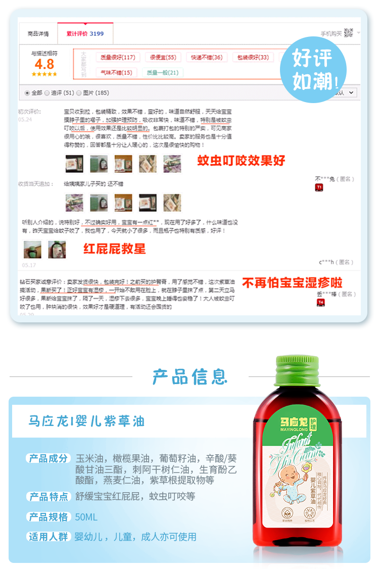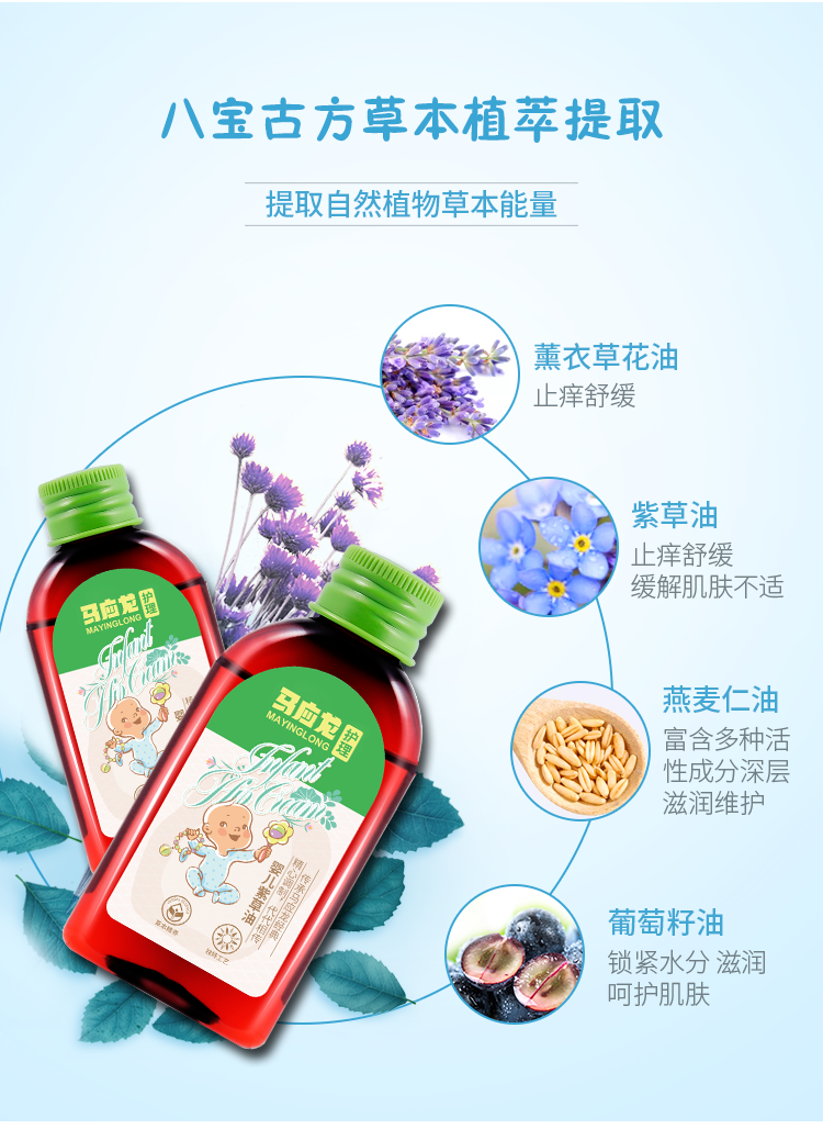 这款马应龙天然紫草油,是专门针对婴幼儿娇嫩的皮肤特质调配的,采用天然草本提取物制成,包括薰衣草花油、紫草油、燕麦仁油、葡萄籽油。