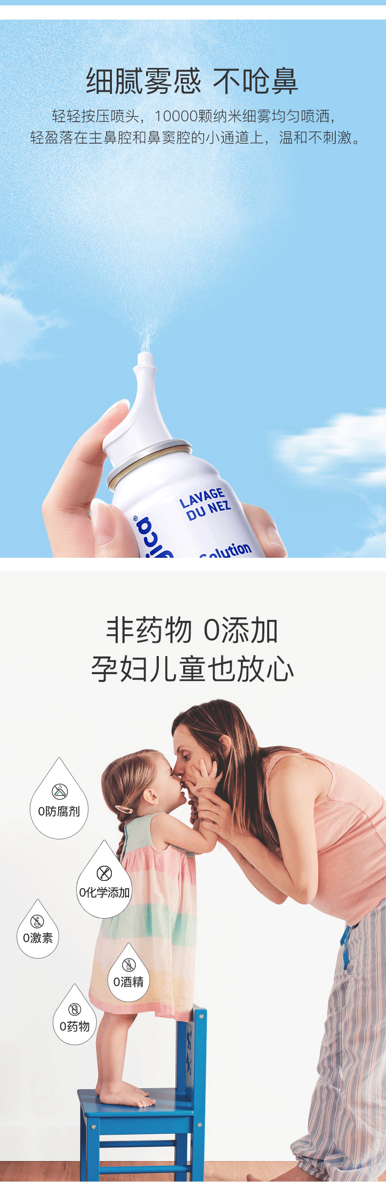 采用法国天使湾深海900m纯净海盐水提炼而成,0污染0细菌,富含多种有益元素,有利于修复鼻粘膜;经过16工序,层层过滤杀菌,达到医用级别的无菌纯净水,可缓解鼻干燥、鼻出血、鼻塞、鼻痒、流涕等鼻腔不适症状,对于鼻炎患者,有很好的效果,适合3岁以上的儿童和成人使用。