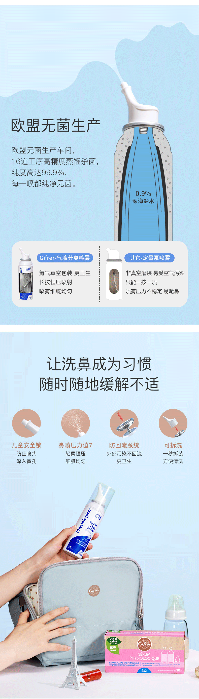 Gifrer一直专注于母婴护理产品,用制药的严苛标准要求日常护理产品。Gifrer所有产品都经过欧盟GMP认证和CE认证,符合欧洲药店的标准。这款深海盐水鼻喷雾正是Gifrer的主打产品,全球每年卖出过亿支。