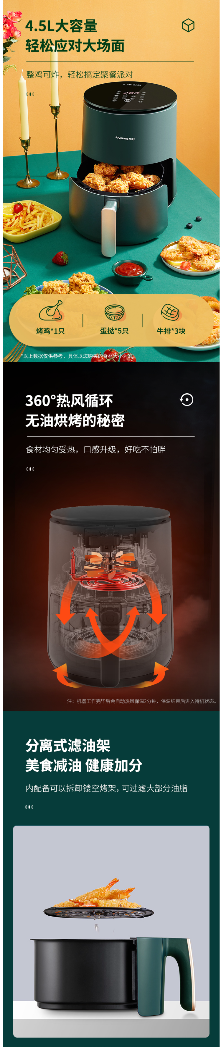 拥有8大预设菜单→薯条、牛排、鸡翅、大虾、蛋挞、蛋糕、红薯、烤肉,可24小时预约定时。锅内容量是4.5L,能满足6-8人可用,一般的空气炸锅只有2L。