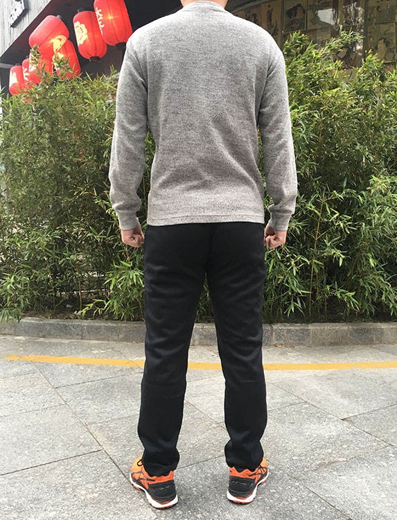 下图是我同事,身高173cm,体重70kg,不算高,腿也不算长,BMI标准。光腿穿的L码修身款,裤腰略宽松,不扎腰带,爬楼梯时裤子会有点掉,但考虑到冬天里面穿秋裤,他还是穿这L码合适,扎腰带就好了。也或许M码的直筒款也可以。